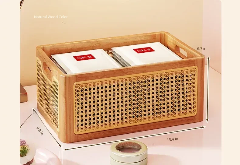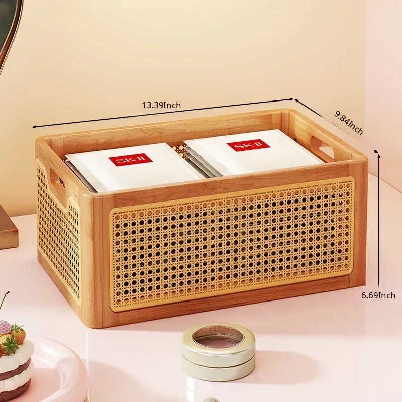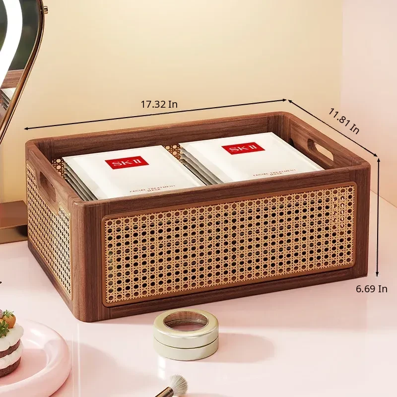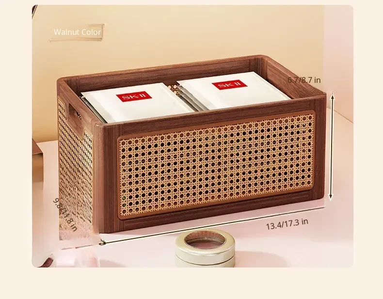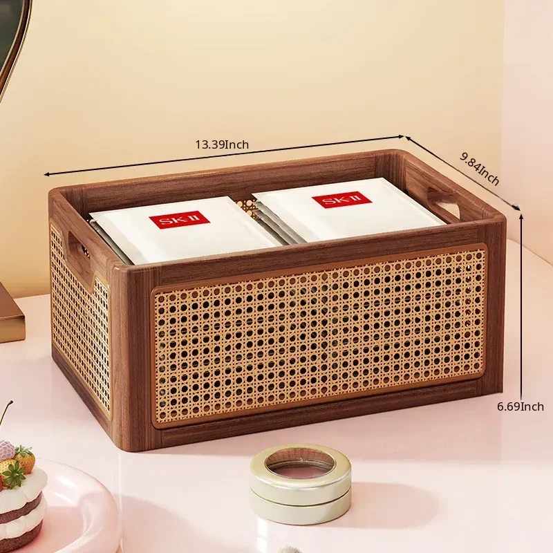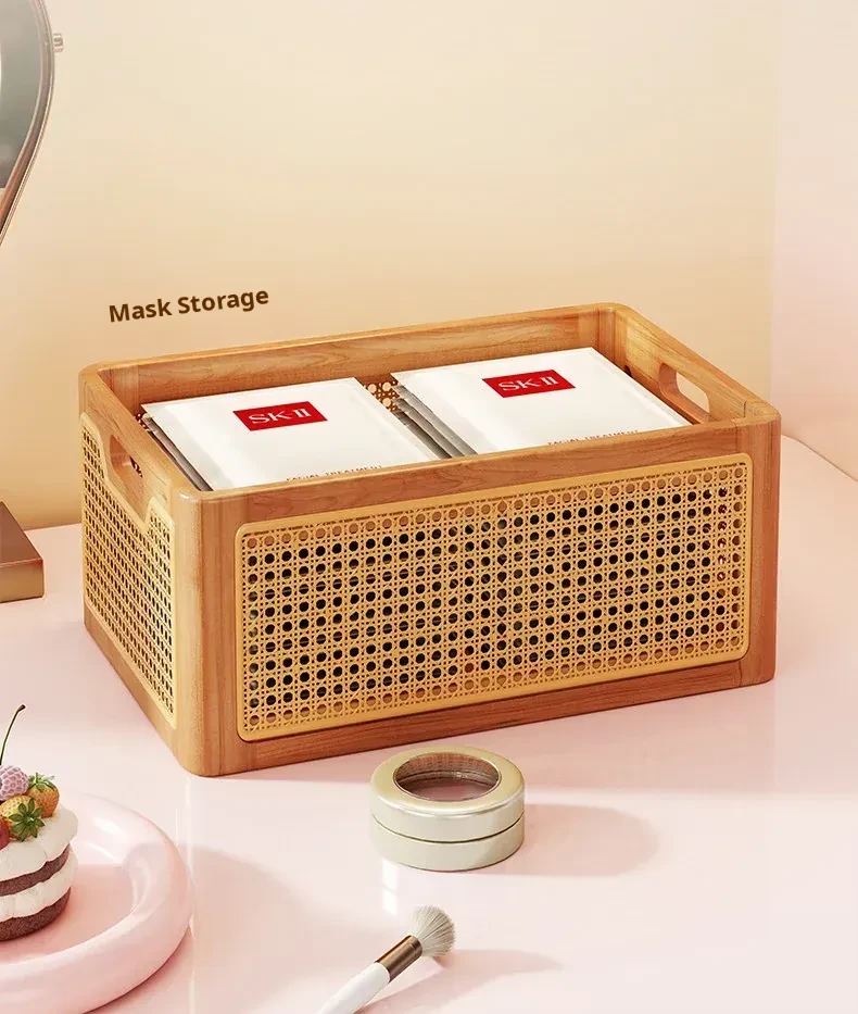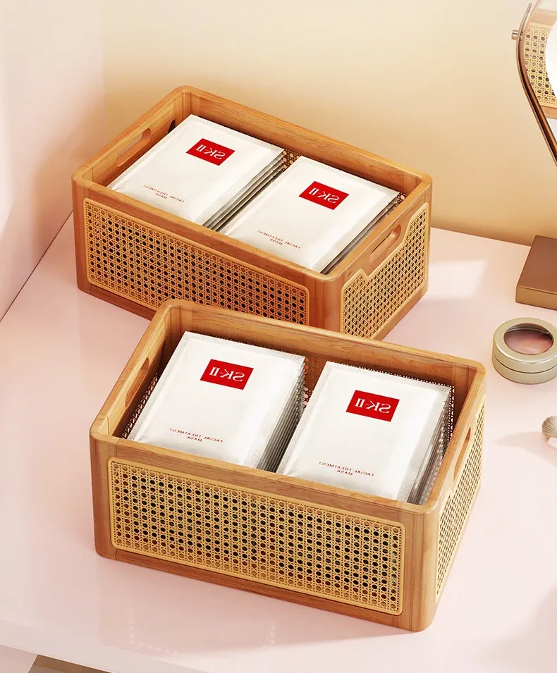 Elegant Wooden Makeup Organizer Box - Stylish Vanity Storage for Skincare, Lipsticks, and Brushes - Chic Rattan Design for a Clutter-Free Desktop