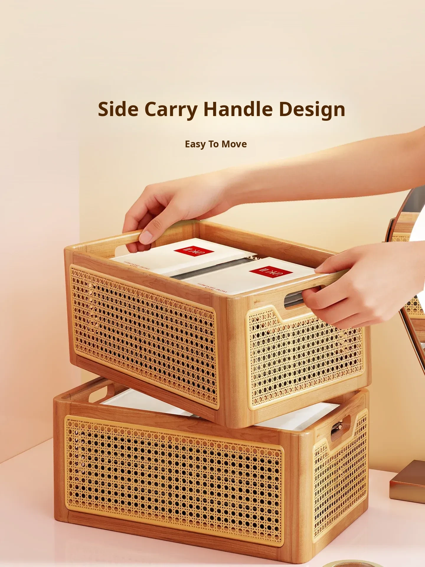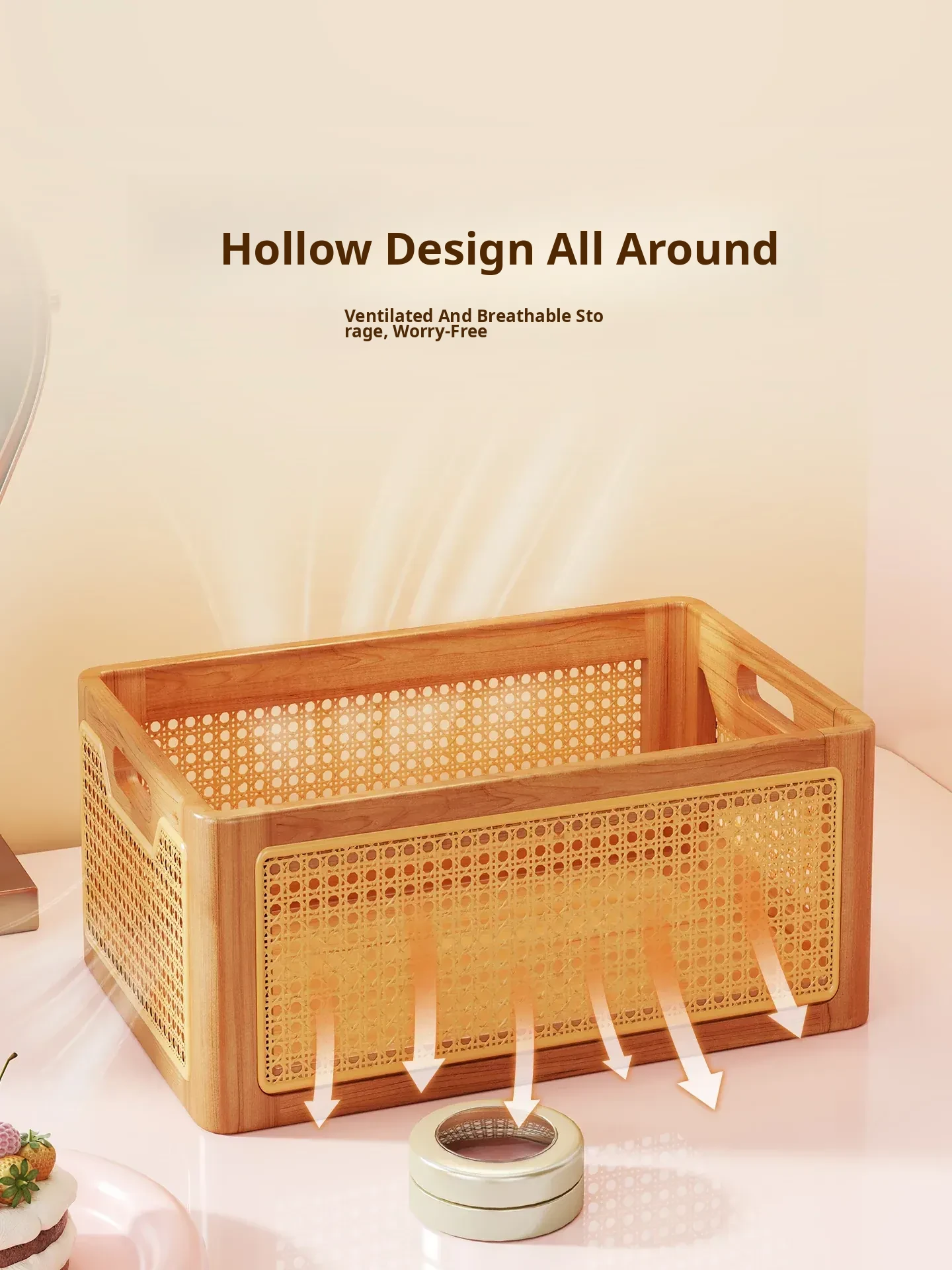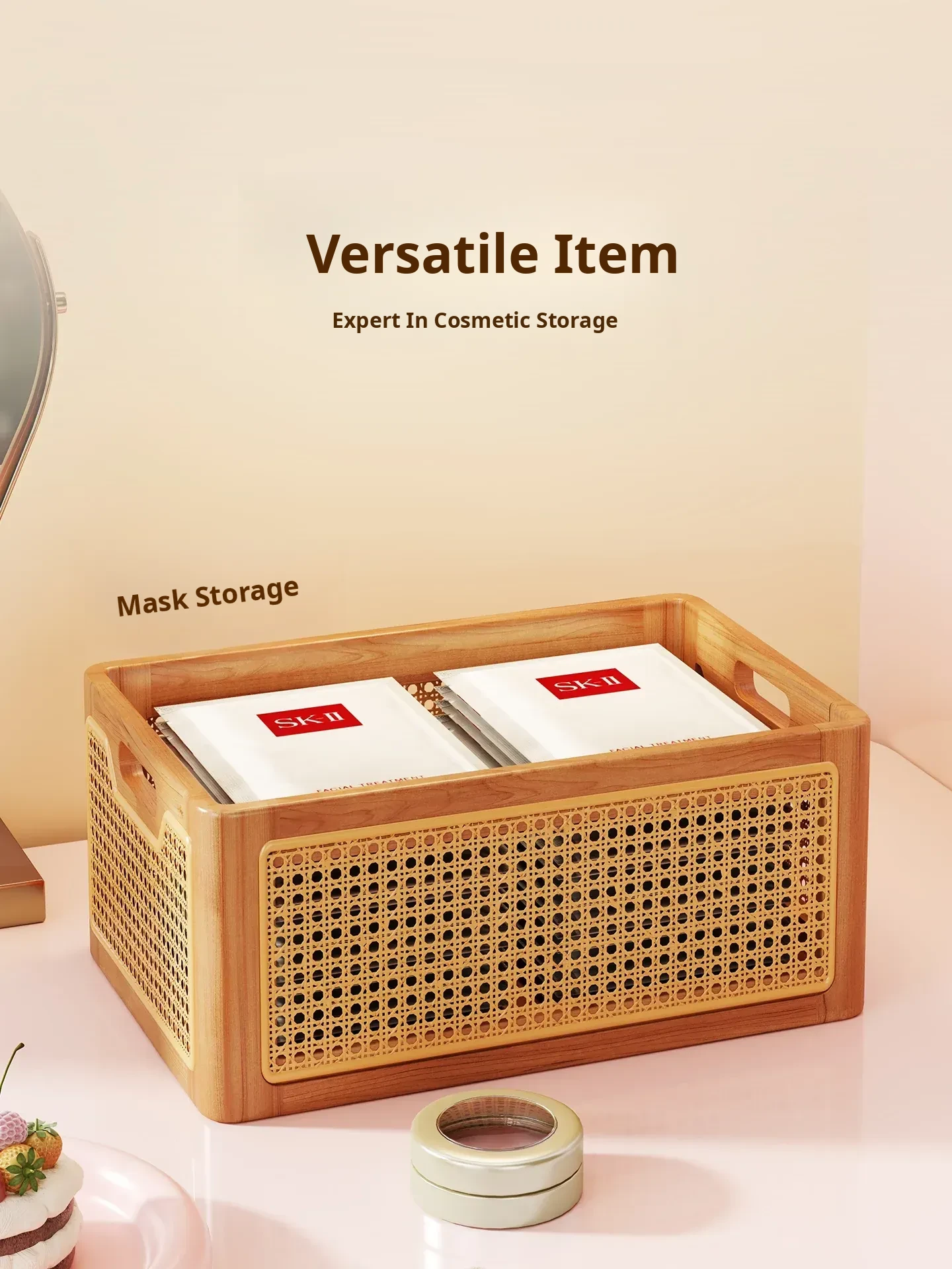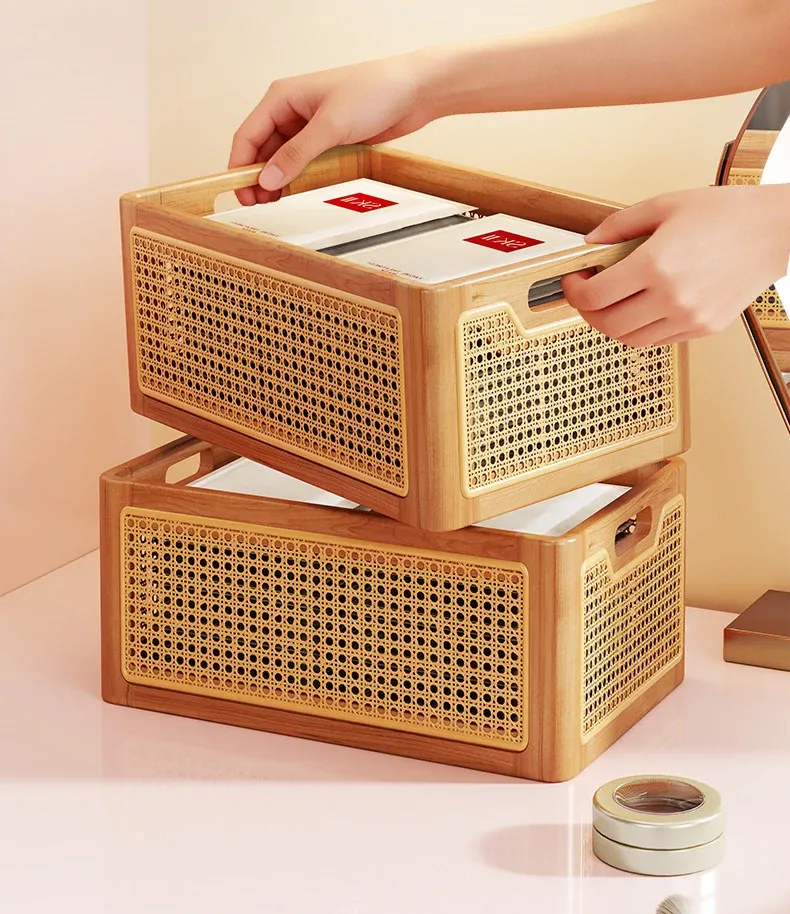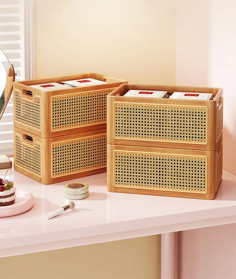 Elegant Wooden Makeup Organizer Box - Stylish Vanity Storage for Skincare, Lipsticks, and Brushes - Chic Rattan Design for a Clutter-Free Desktop