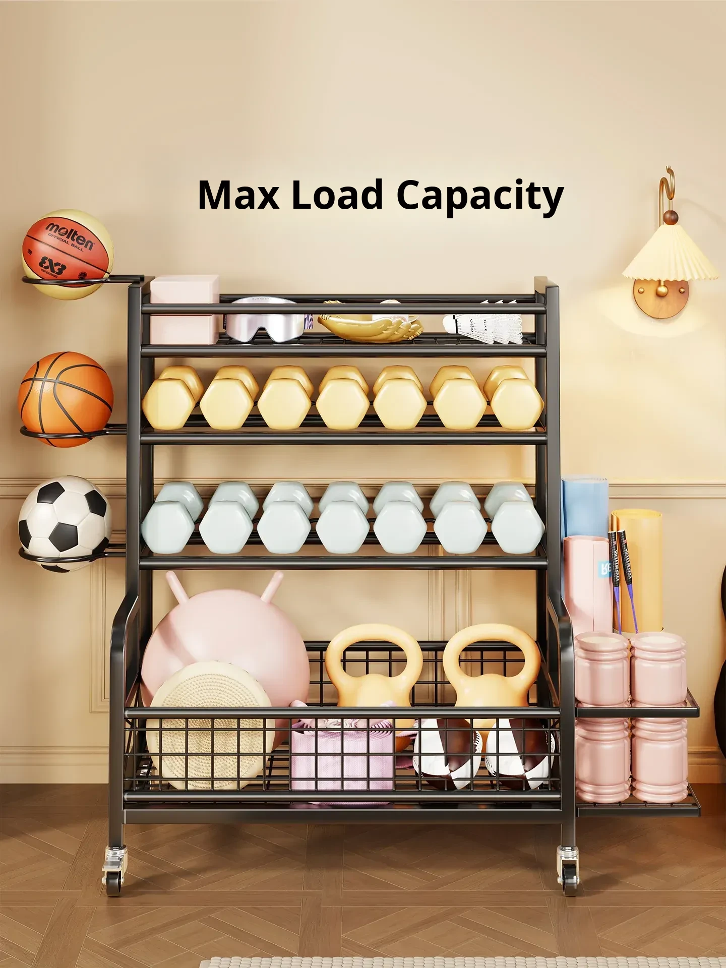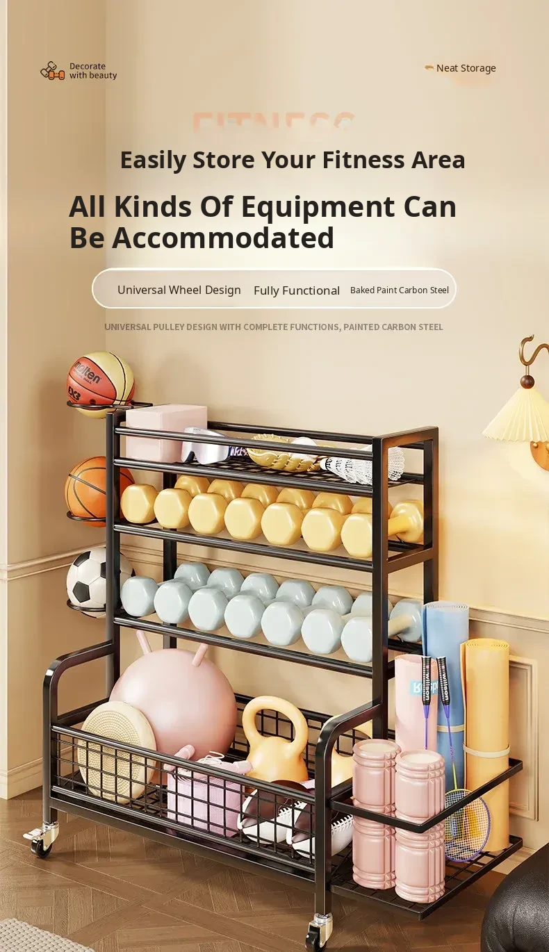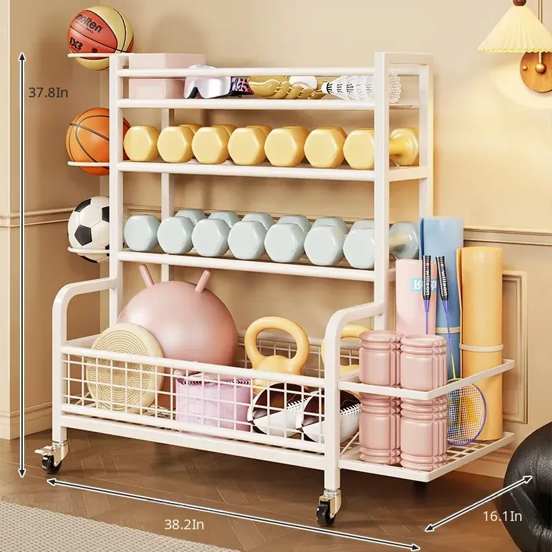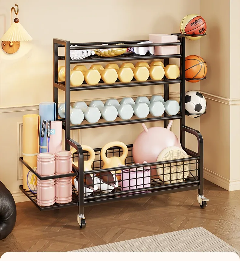 Home Gym Storage Rack on Wheels for Kettlebells, Dumbbells, Foam Rollers, Yoga Mats, Storage Baskets, and Basketball Hoops - Keep Your Workout Space Organized and Efficient!
