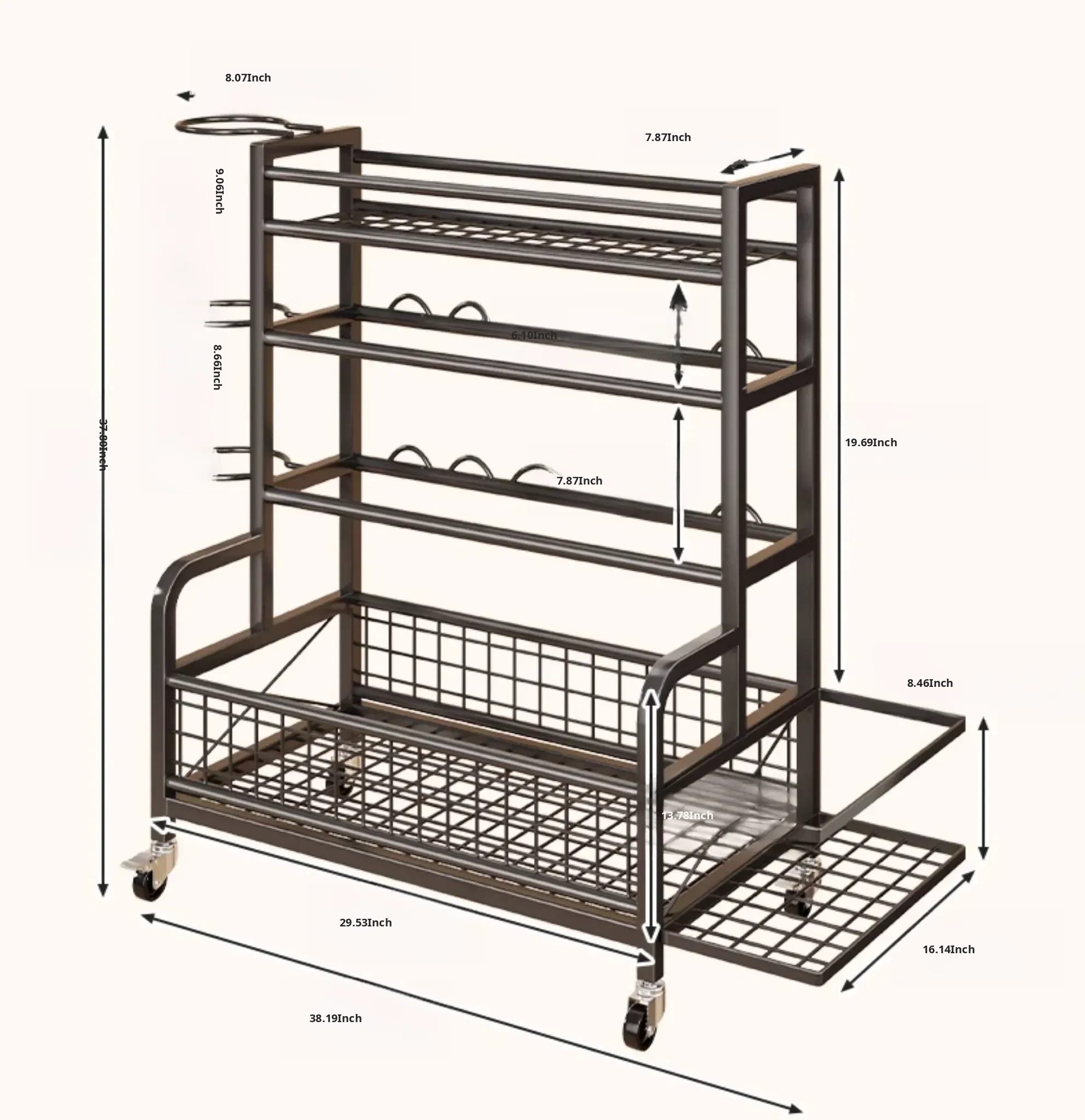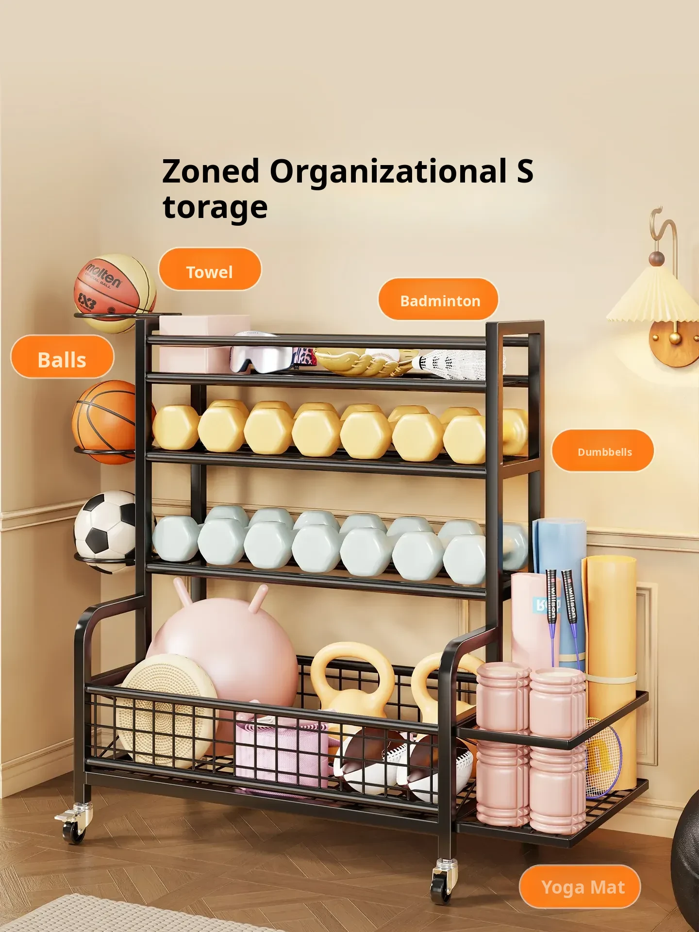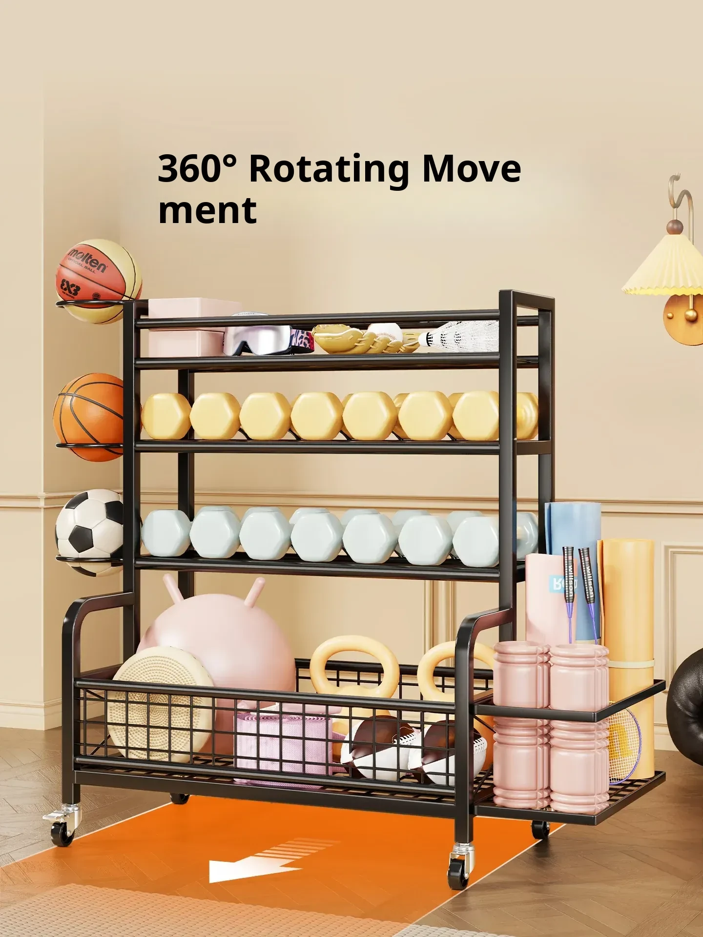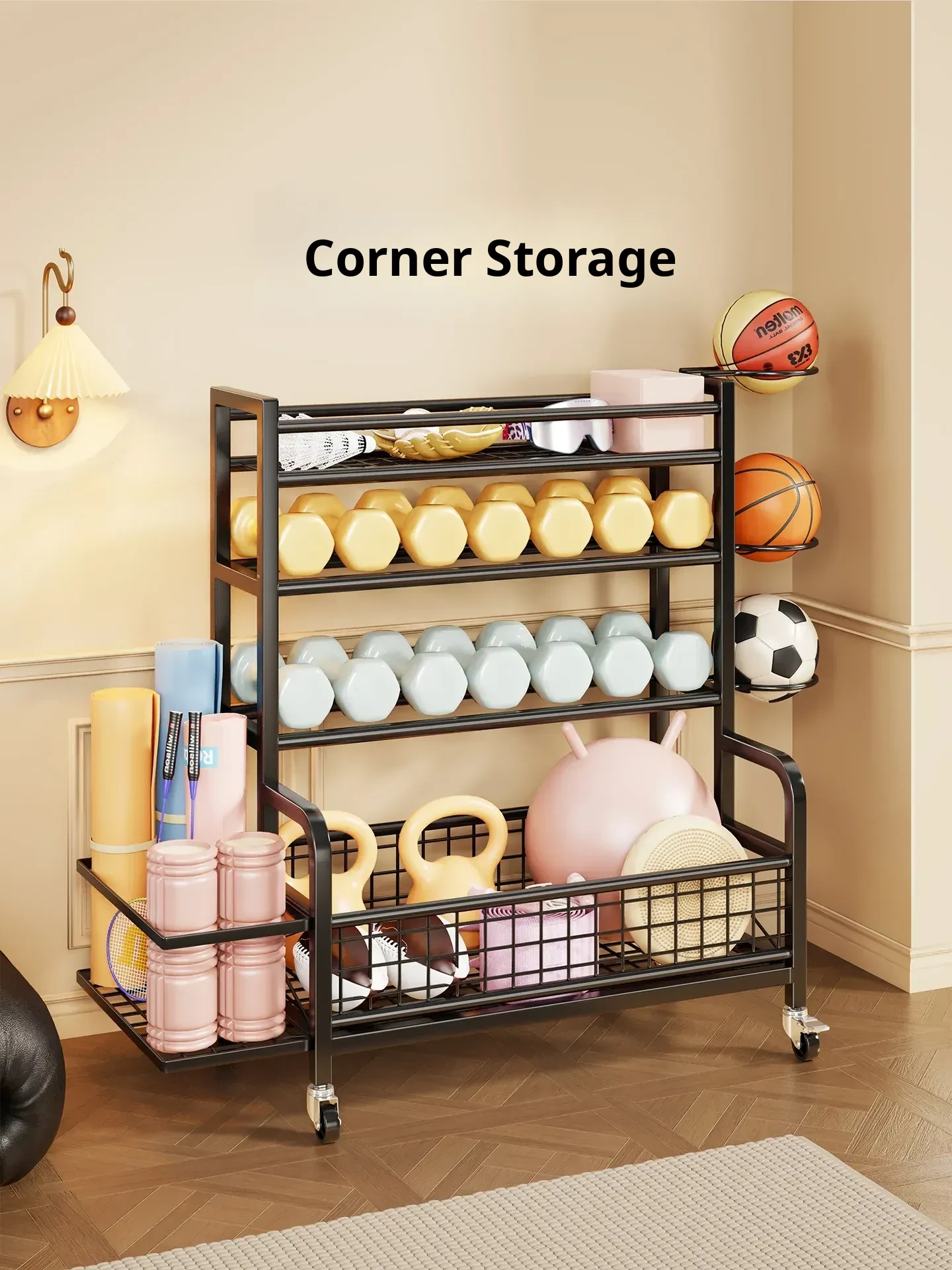 Home Gym Storage Rack on Wheels for Kettlebells, Dumbbells, Foam Rollers, Yoga Mats, Storage Baskets, and Basketball Hoops - Keep Your Workout Space Organized and Efficient!