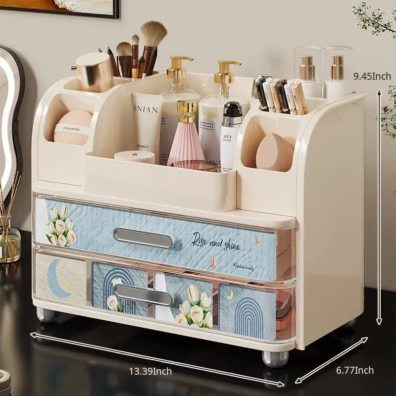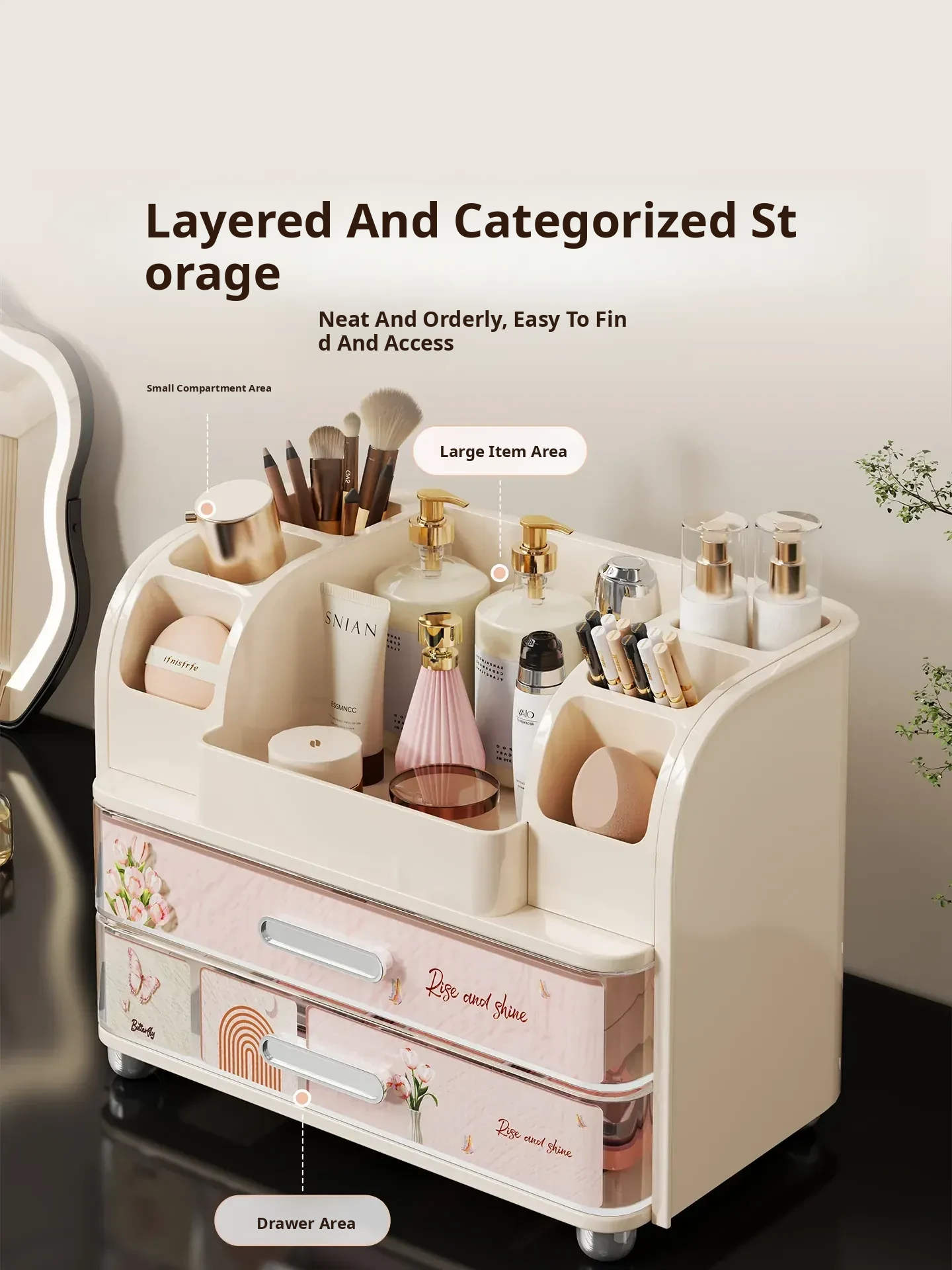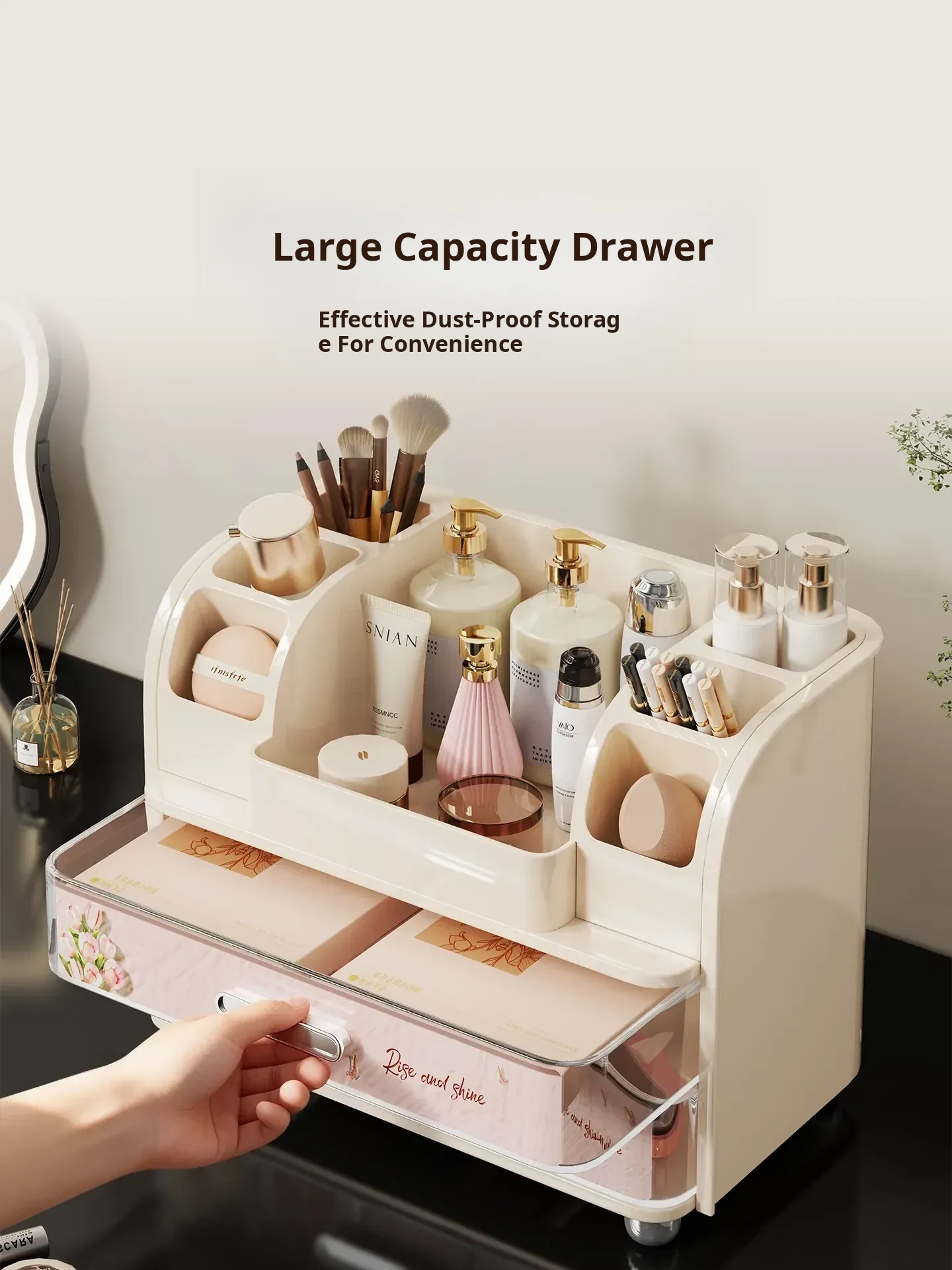 Luxury Dustproof Makeup Organizer with Multi-Layer Drawers - Elegant Vanity Storage for Skincare Products, Lipsticks, and Eyeliners - Perfect for a Stylish and Tidy Desktop!