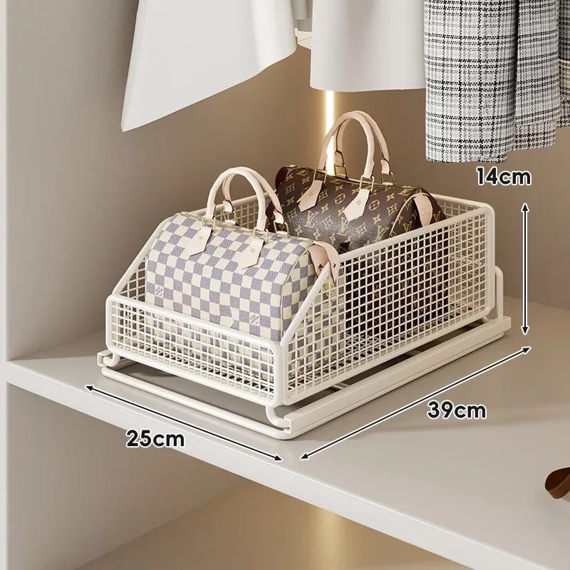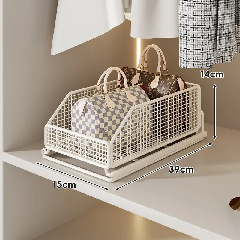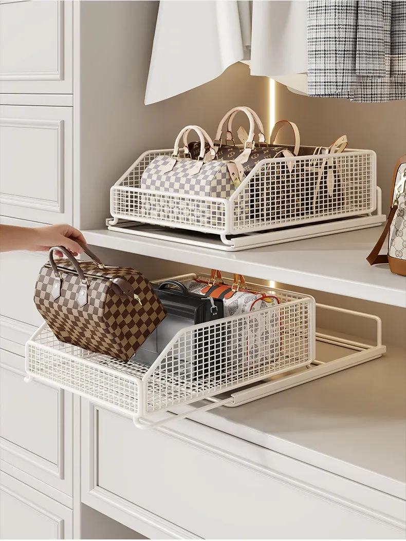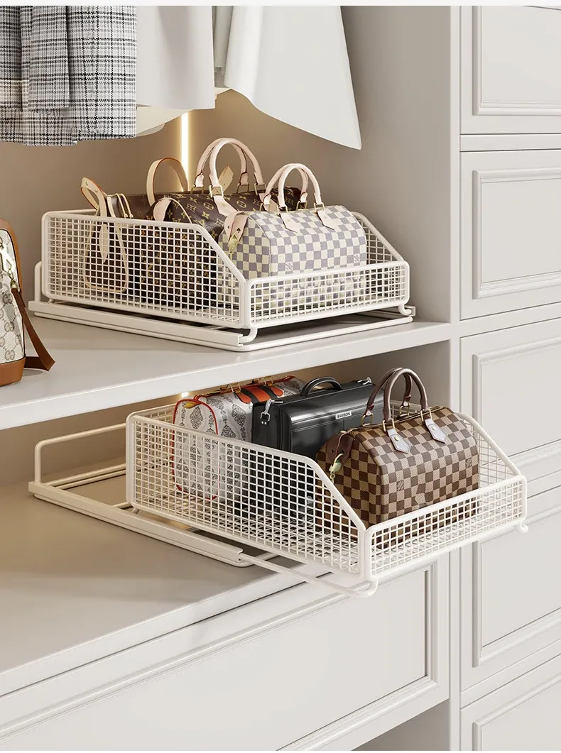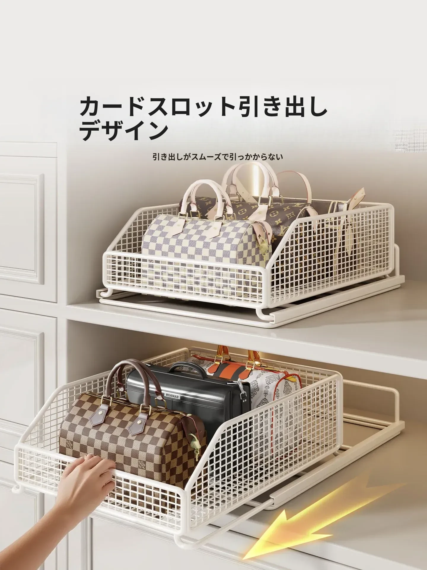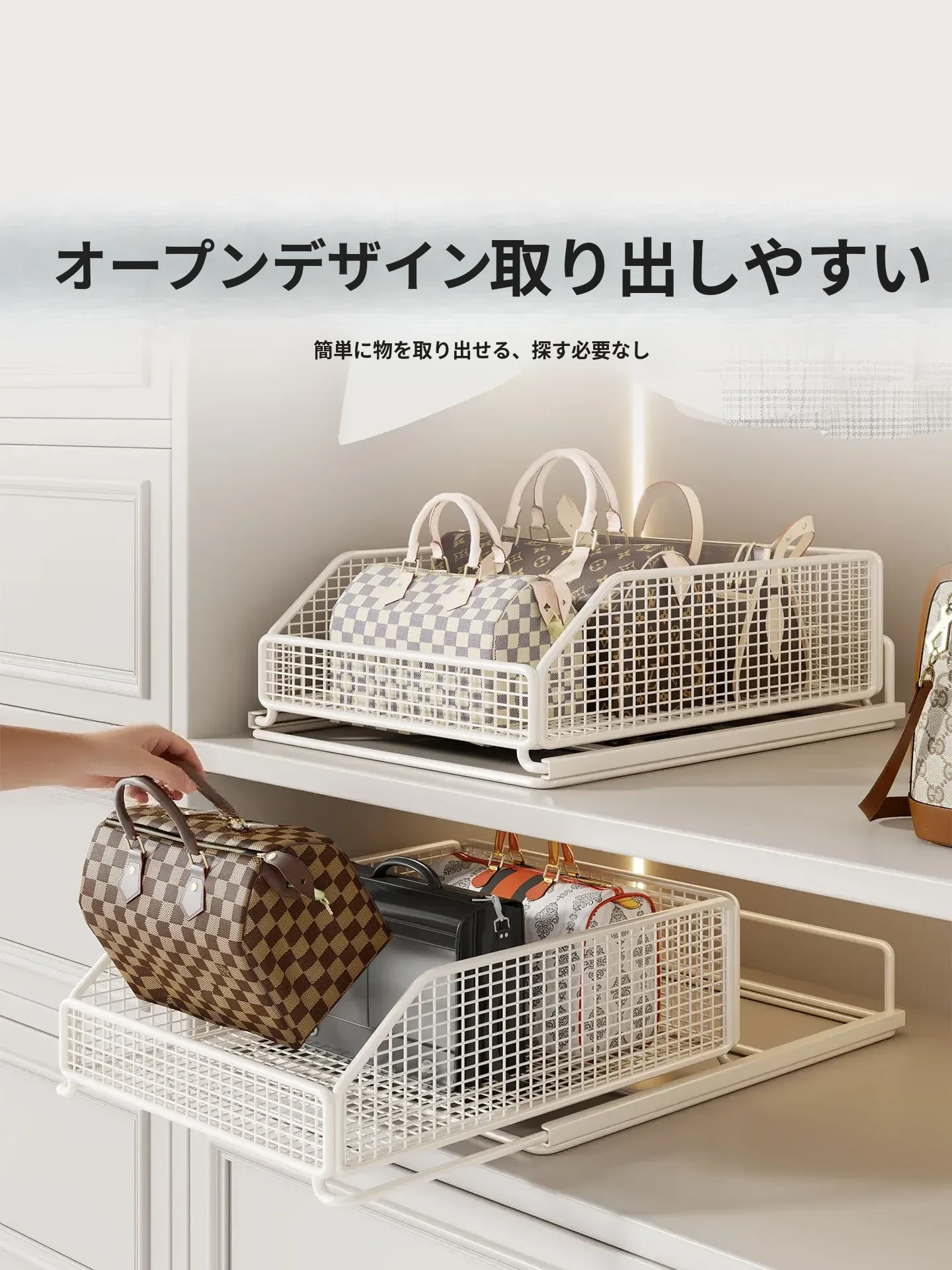 クローゼット引き出し式伸縮型バッグ収納ラック - 穴あけ不要で簡単設置!家庭用クローゼットに最適な分別収納ネットバスケット。整理整頓が楽々!