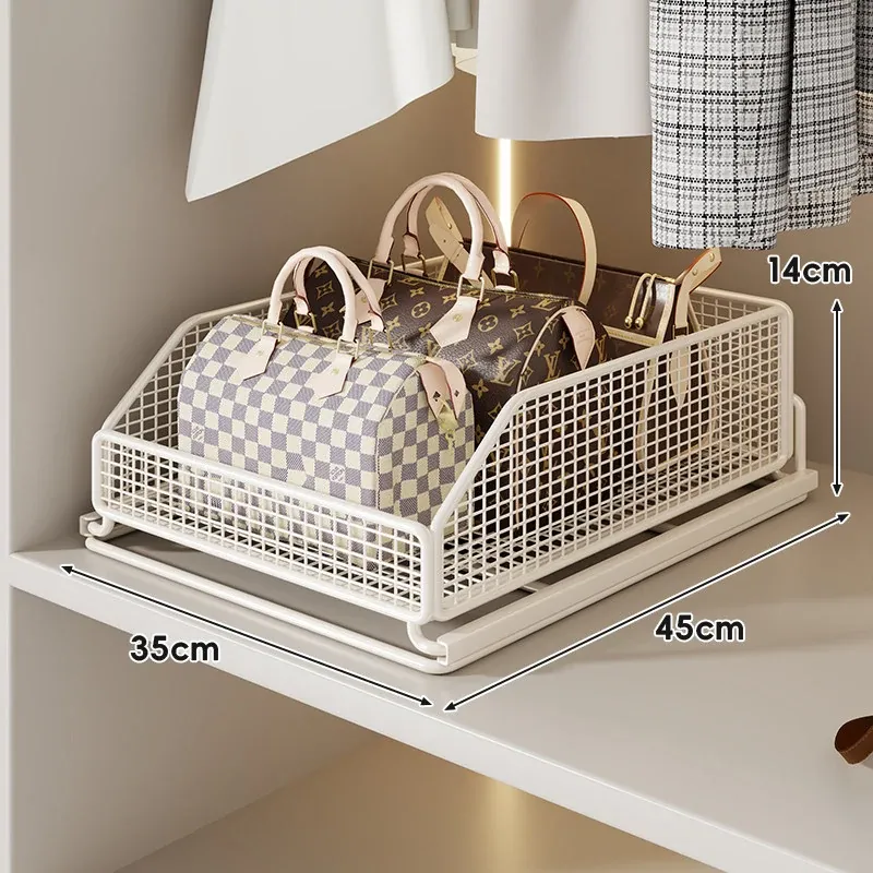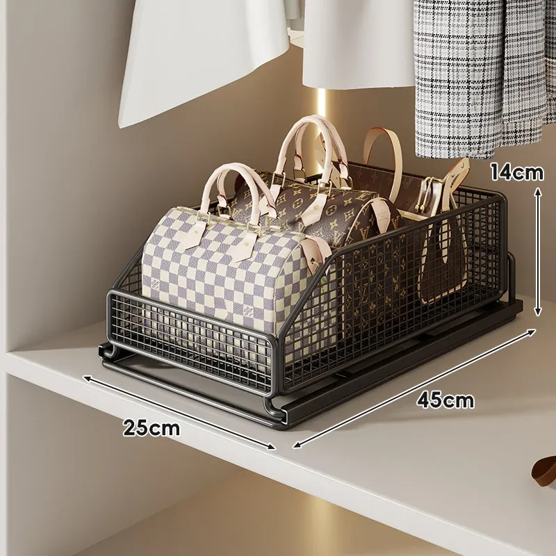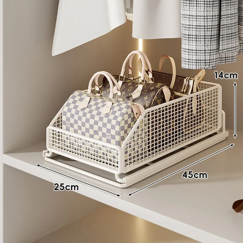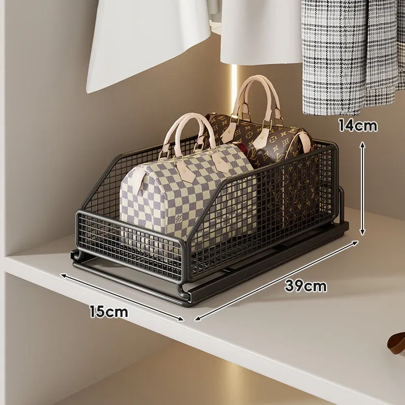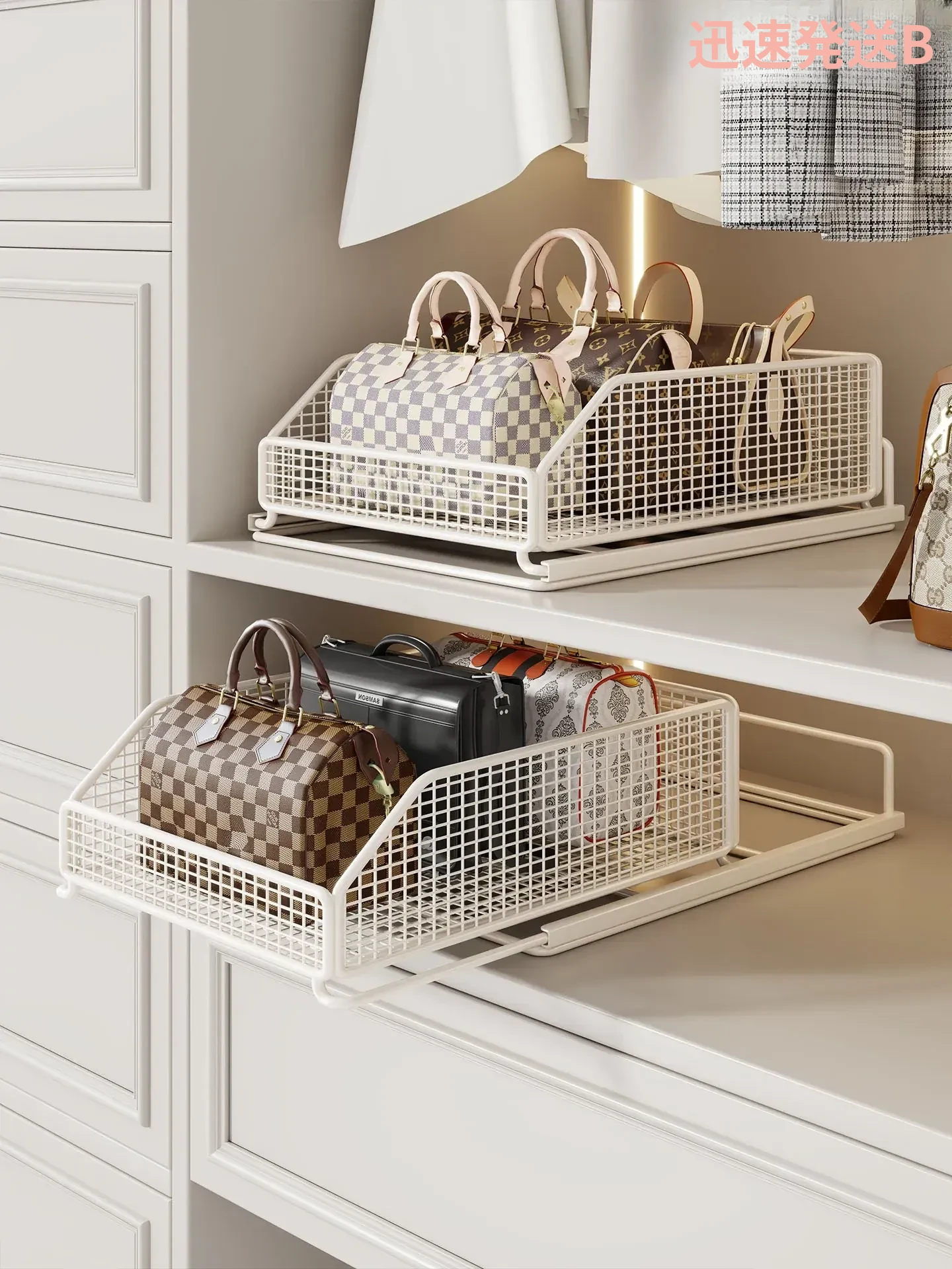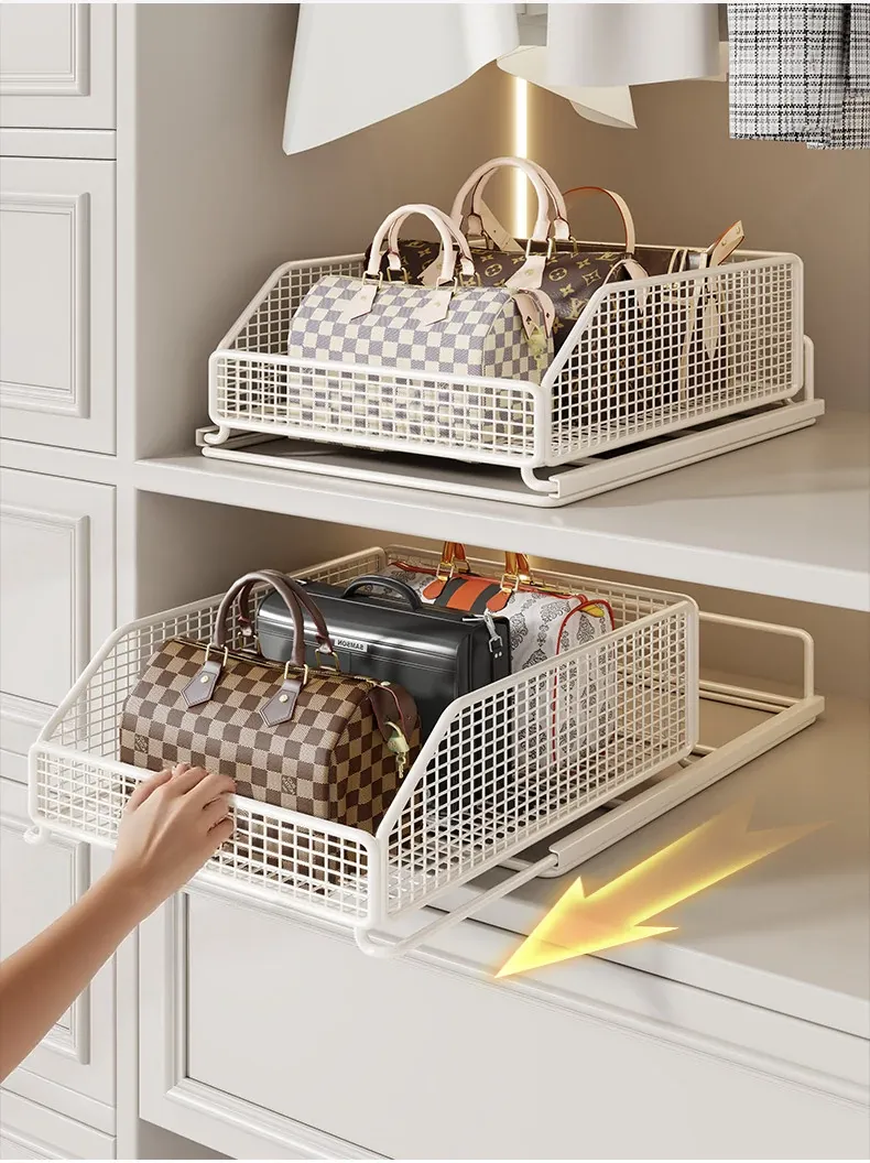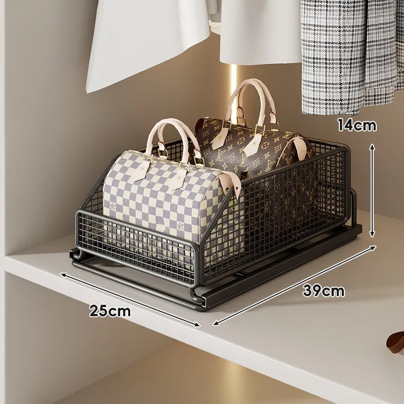 クローゼット引き出し式伸縮型バッグ収納ラック - 穴あけ不要で簡単設置!家庭用クローゼットに最適な分別収納ネットバスケット。整理整頓が楽々!