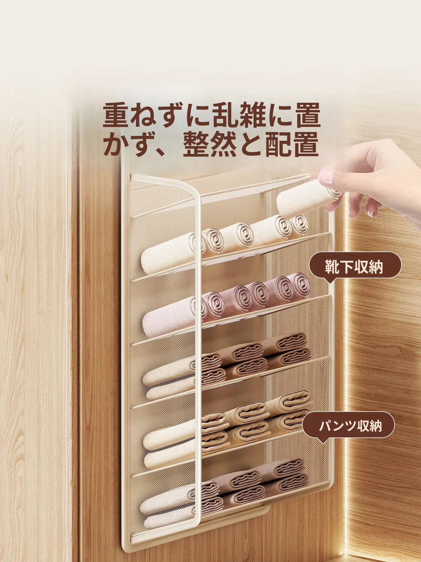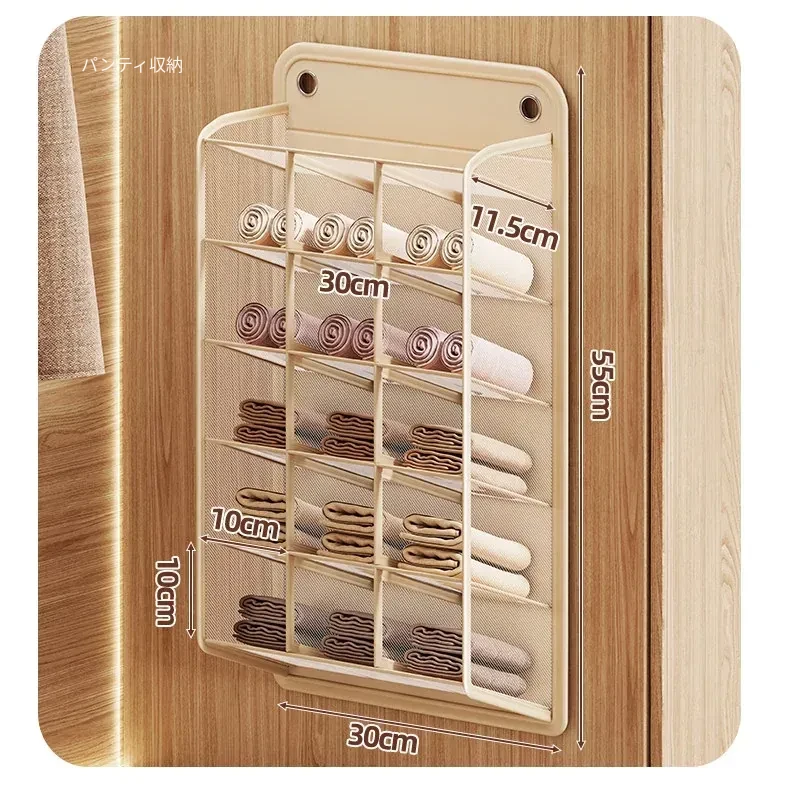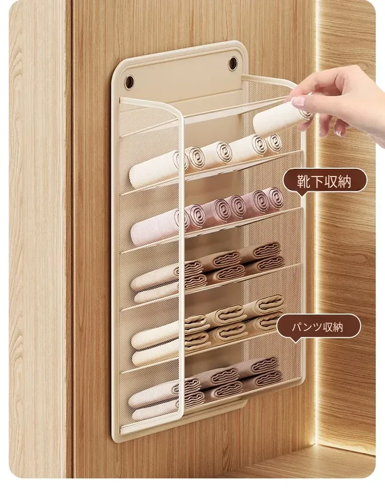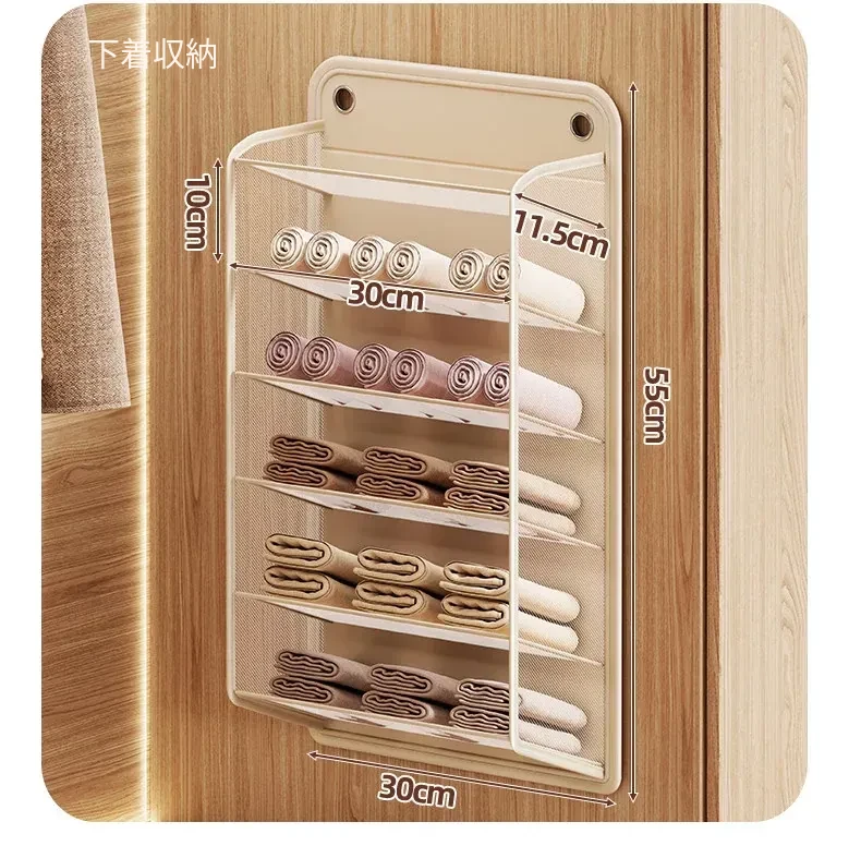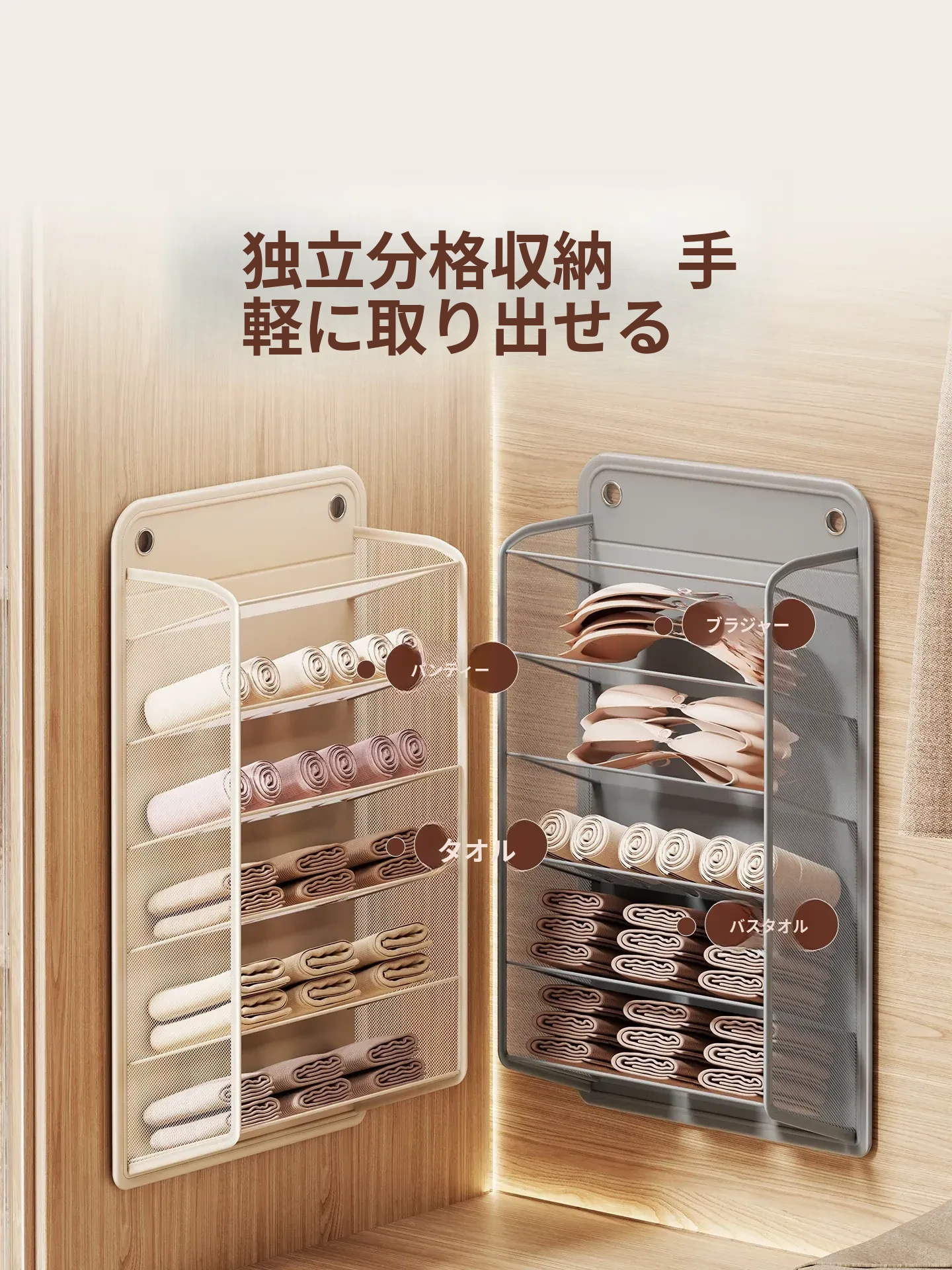 穴を開けずに簡単取り付け!内衣収納ハンギングポケット - 家庭用クローゼットに最適な仕切り付きで、下着や靴下をすっきり整理。省スペースで見た目もスッキリ!