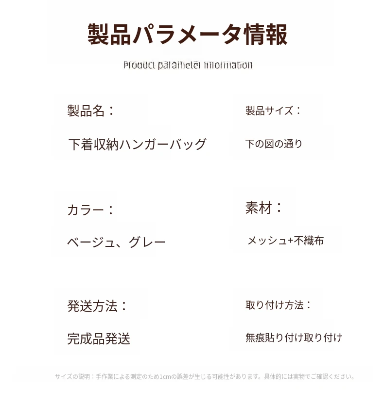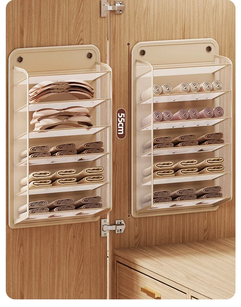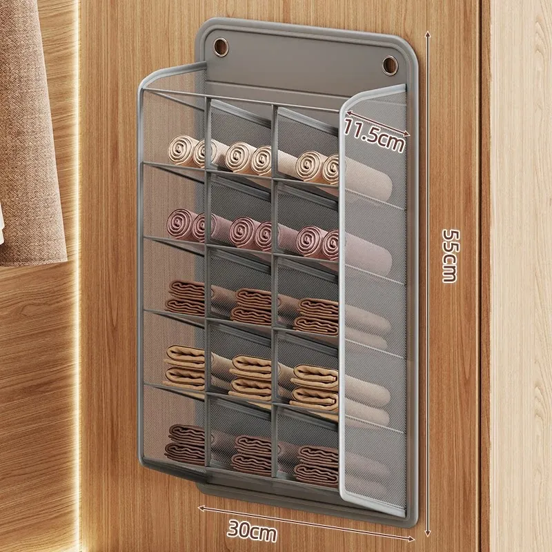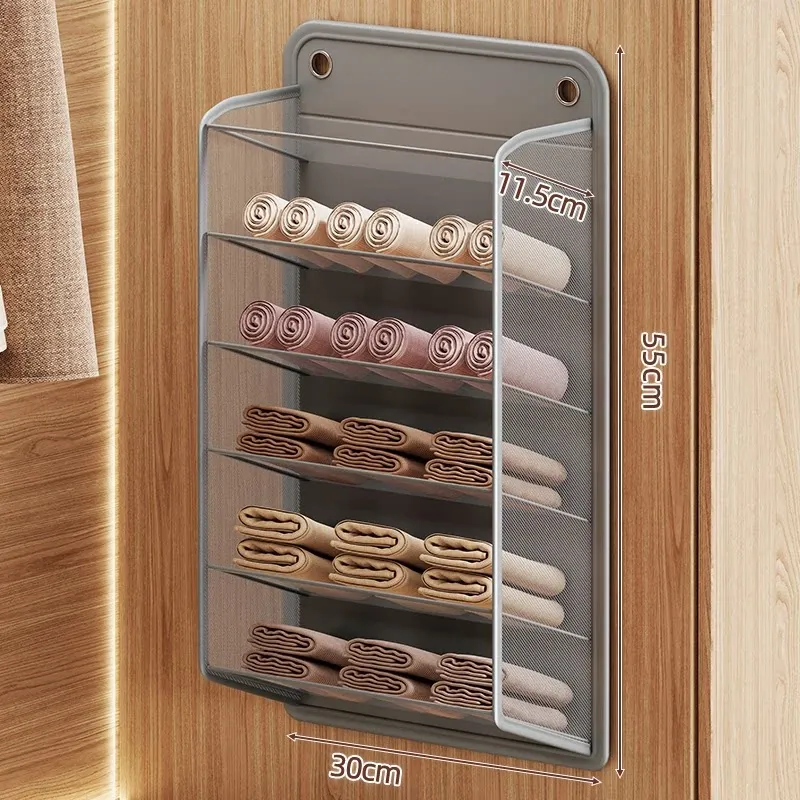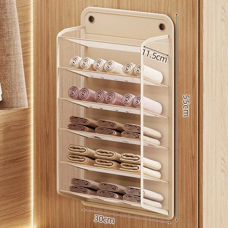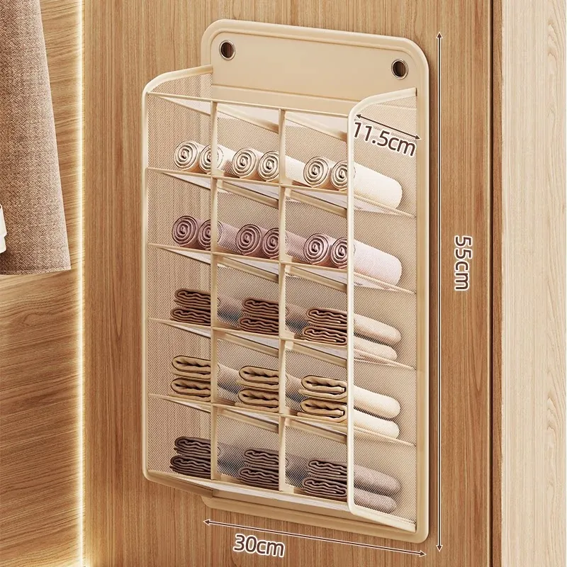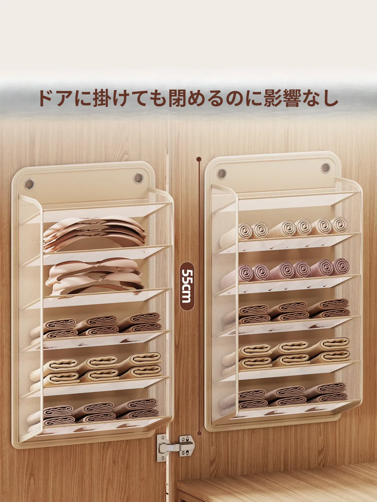 穴を開けずに簡単取り付け!内衣収納ハンギングポケット - 家庭用クローゼットに最適な仕切り付きで、下着や靴下をすっきり整理。省スペースで見た目もスッキリ!