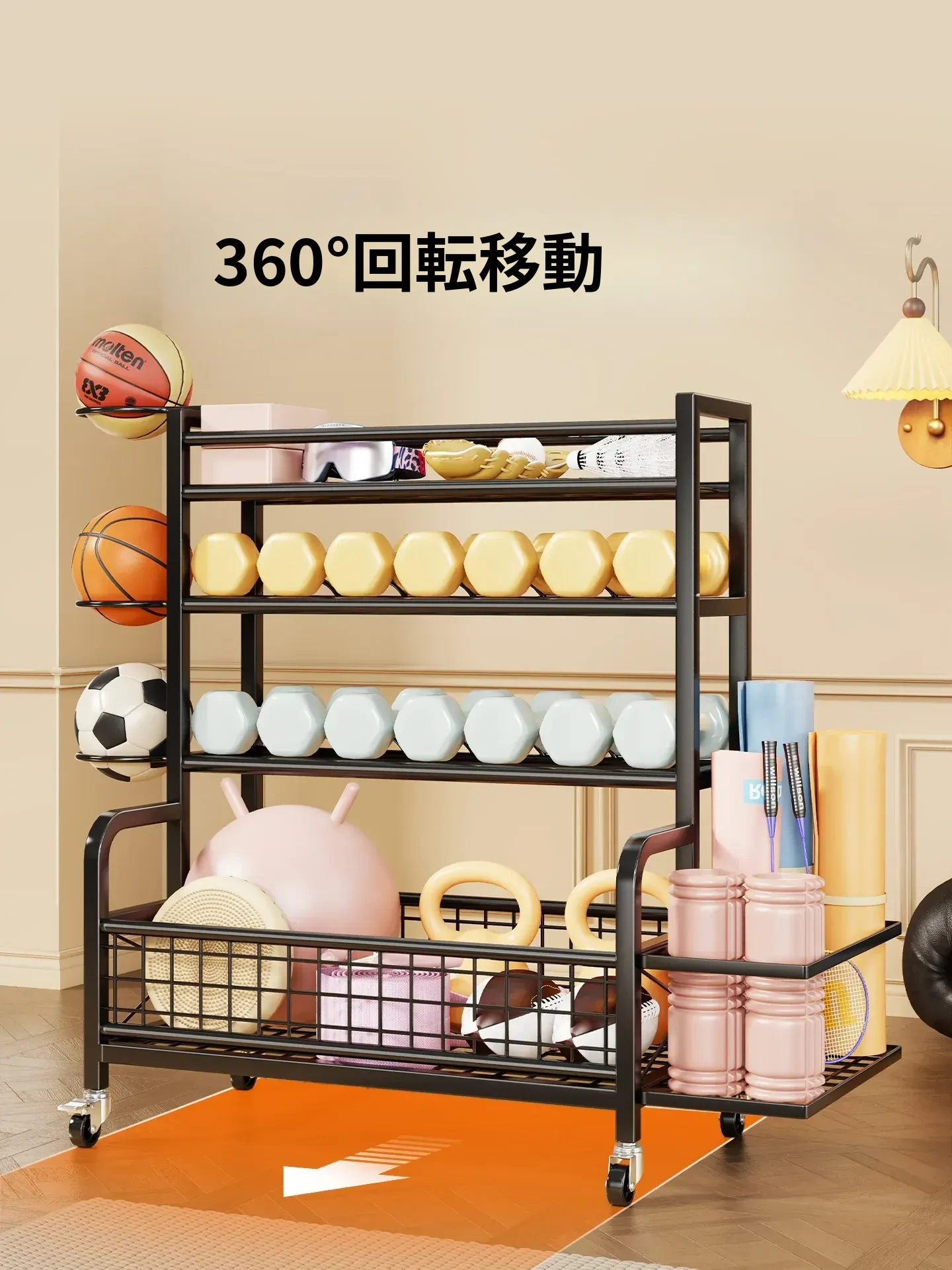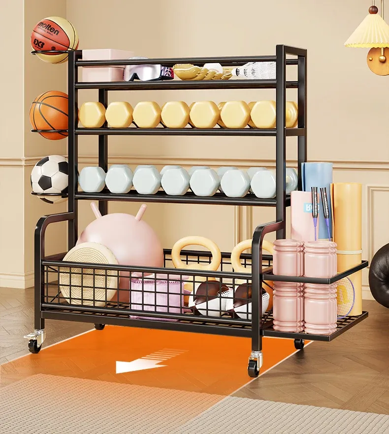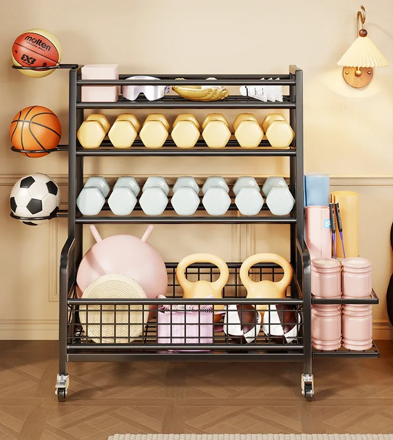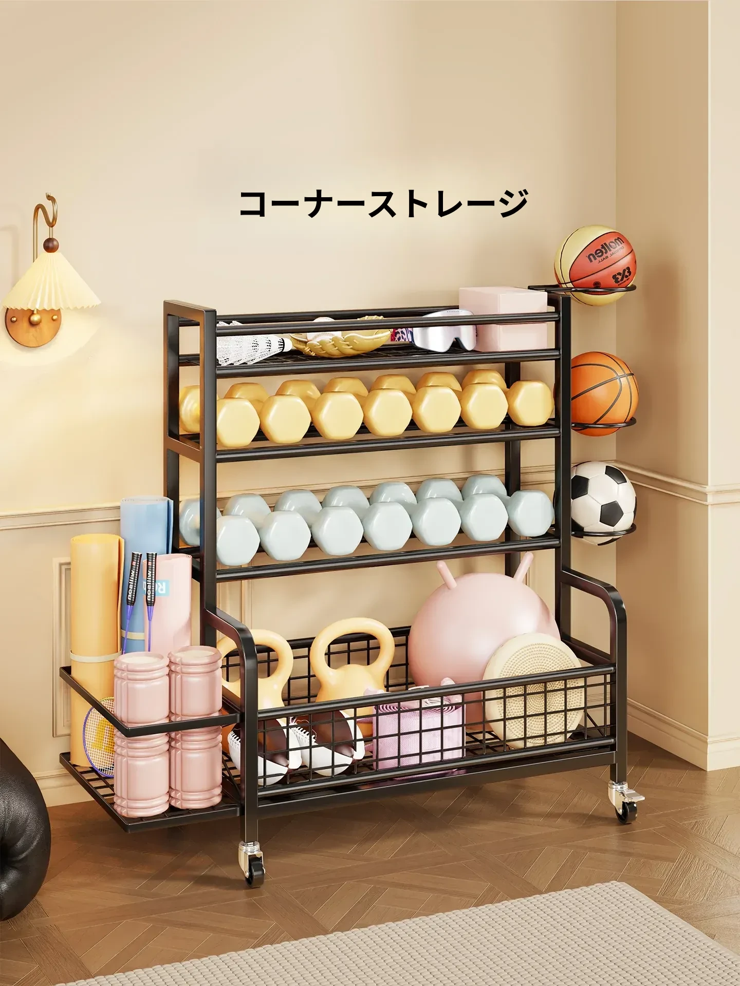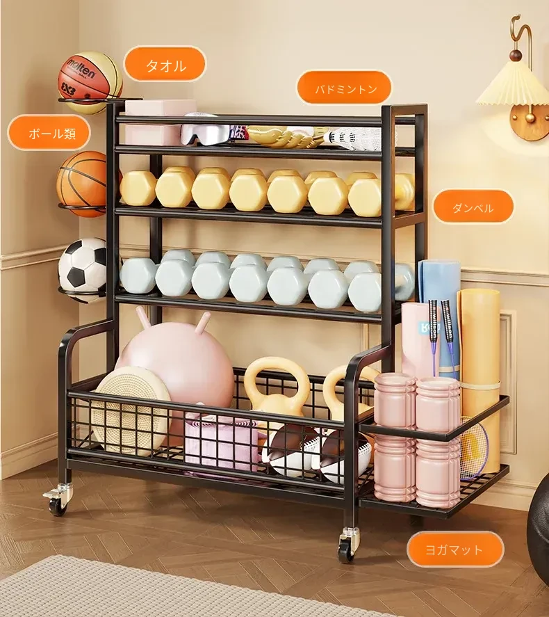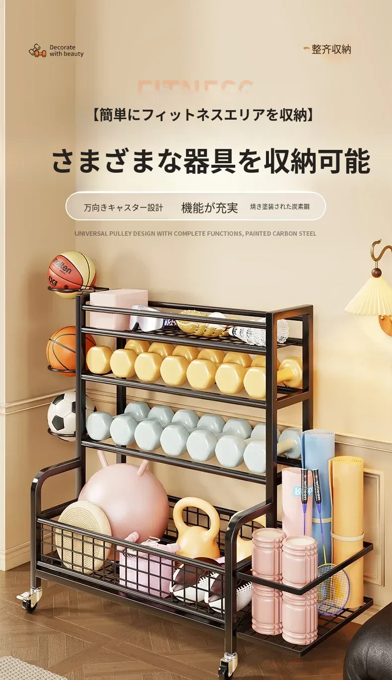 家庭用フィットネス器具収納ラック|キャスター付きで移動も楽々!ケトルベルやダンベル、フォームローラー、ヨガマット、収納バスケット、バスケットボールスタンドも一括整理!運動環境をスッキリ整えよう!