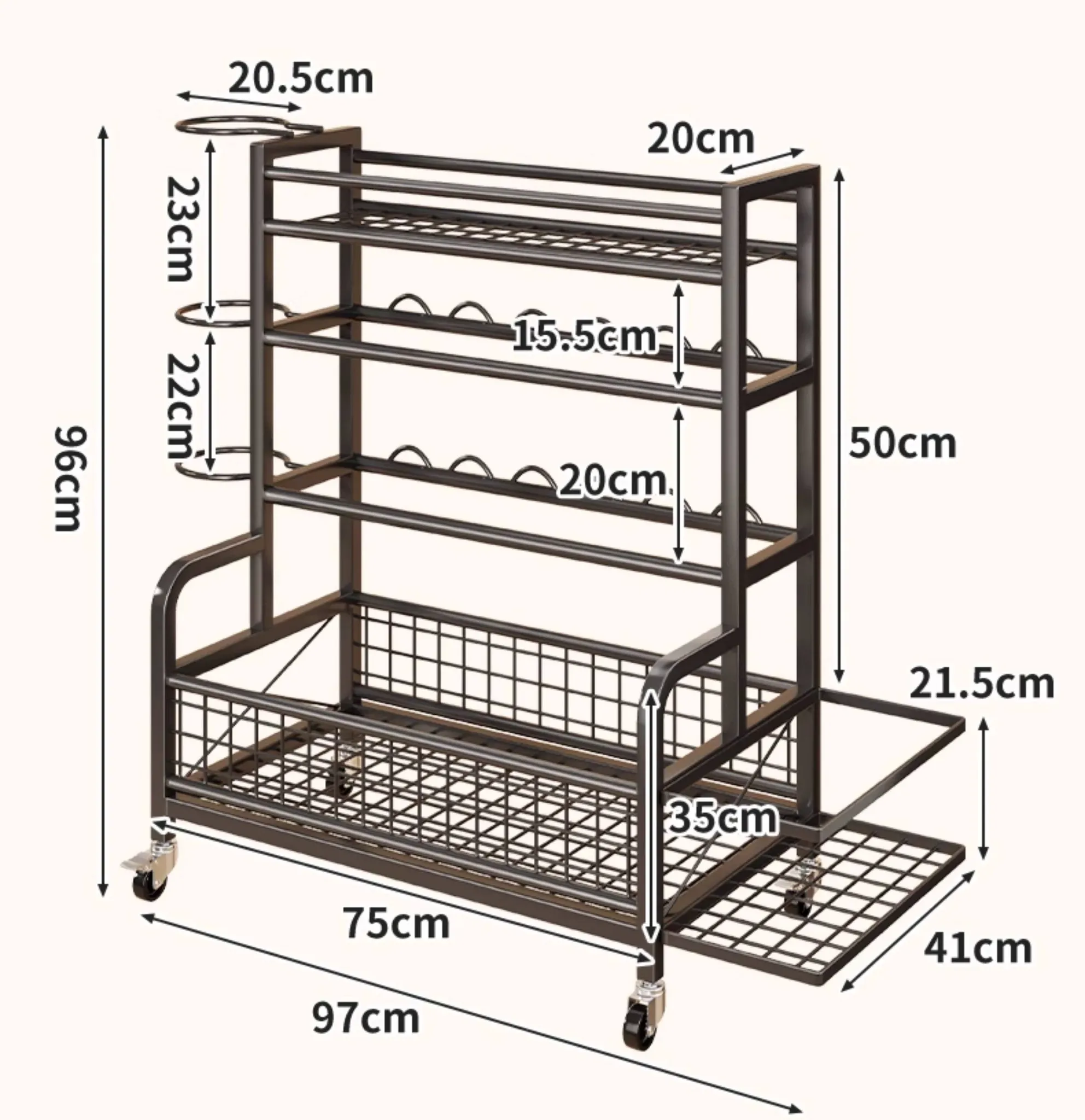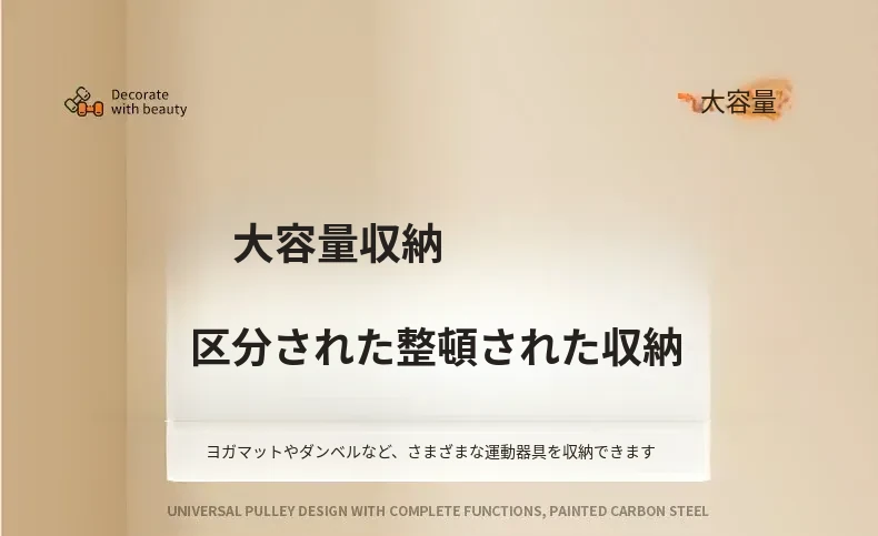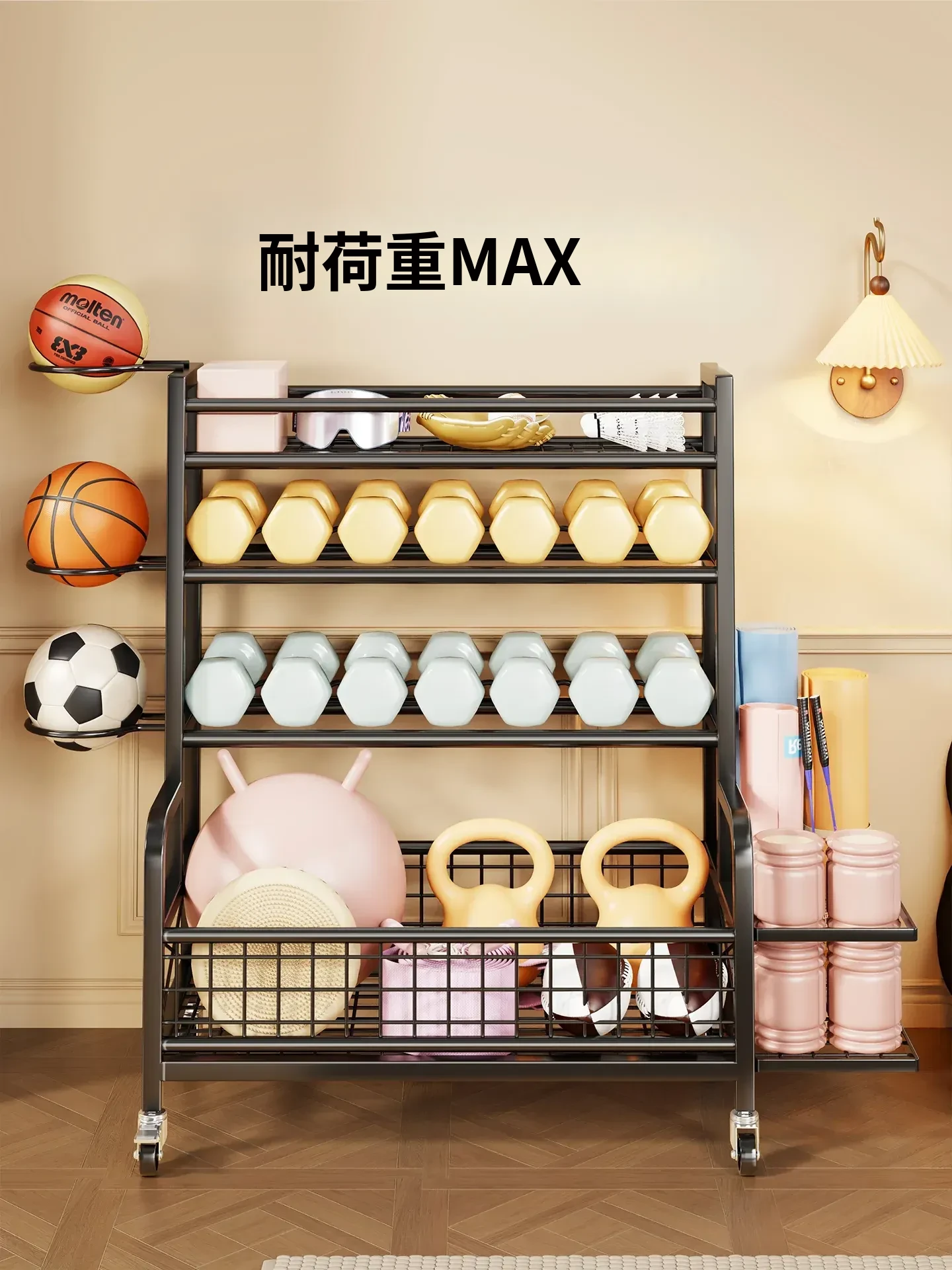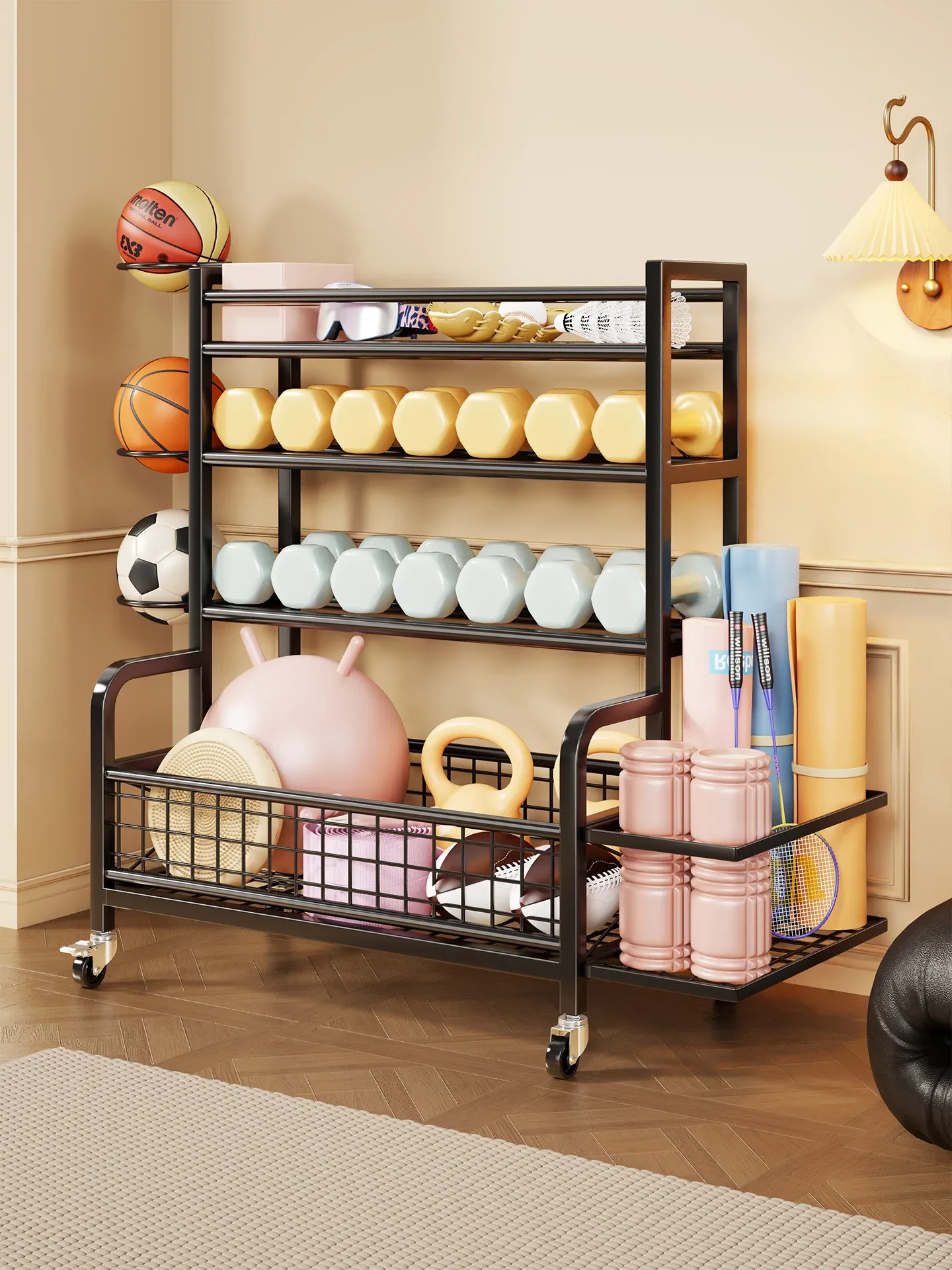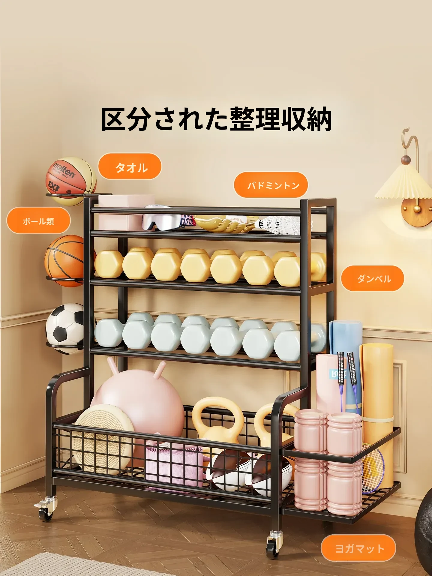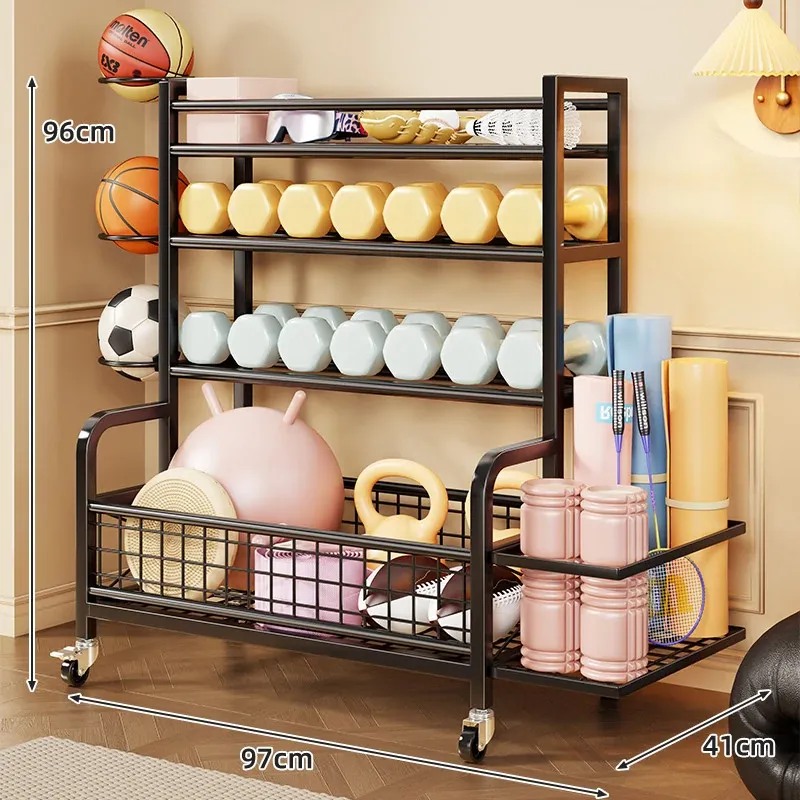 家庭用フィットネス器具収納ラック|キャスター付きで移動も楽々!ケトルベルやダンベル、フォームローラー、ヨガマット、収納バスケット、バスケットボールスタンドも一括整理!運動環境をスッキリ整えよう!