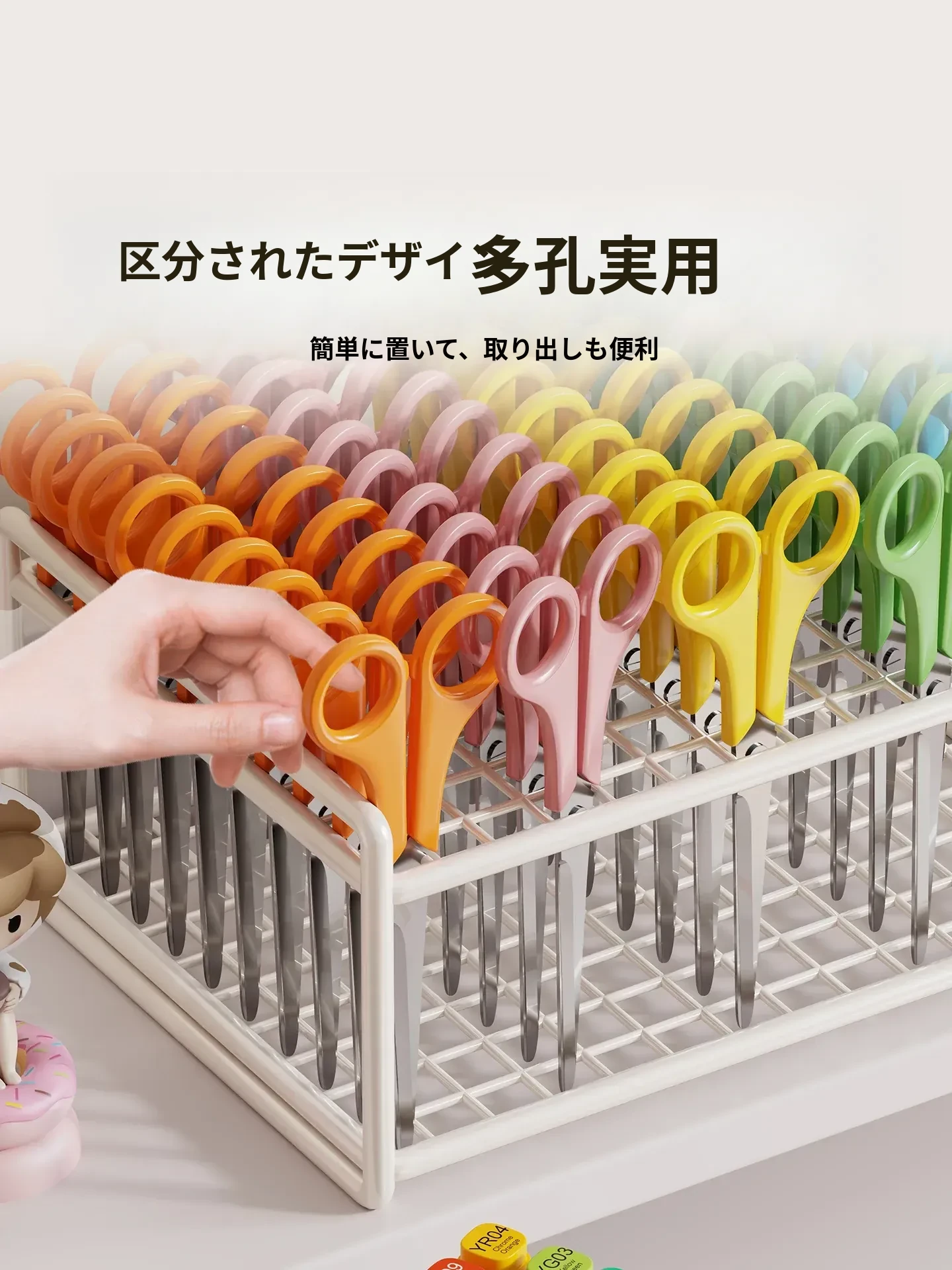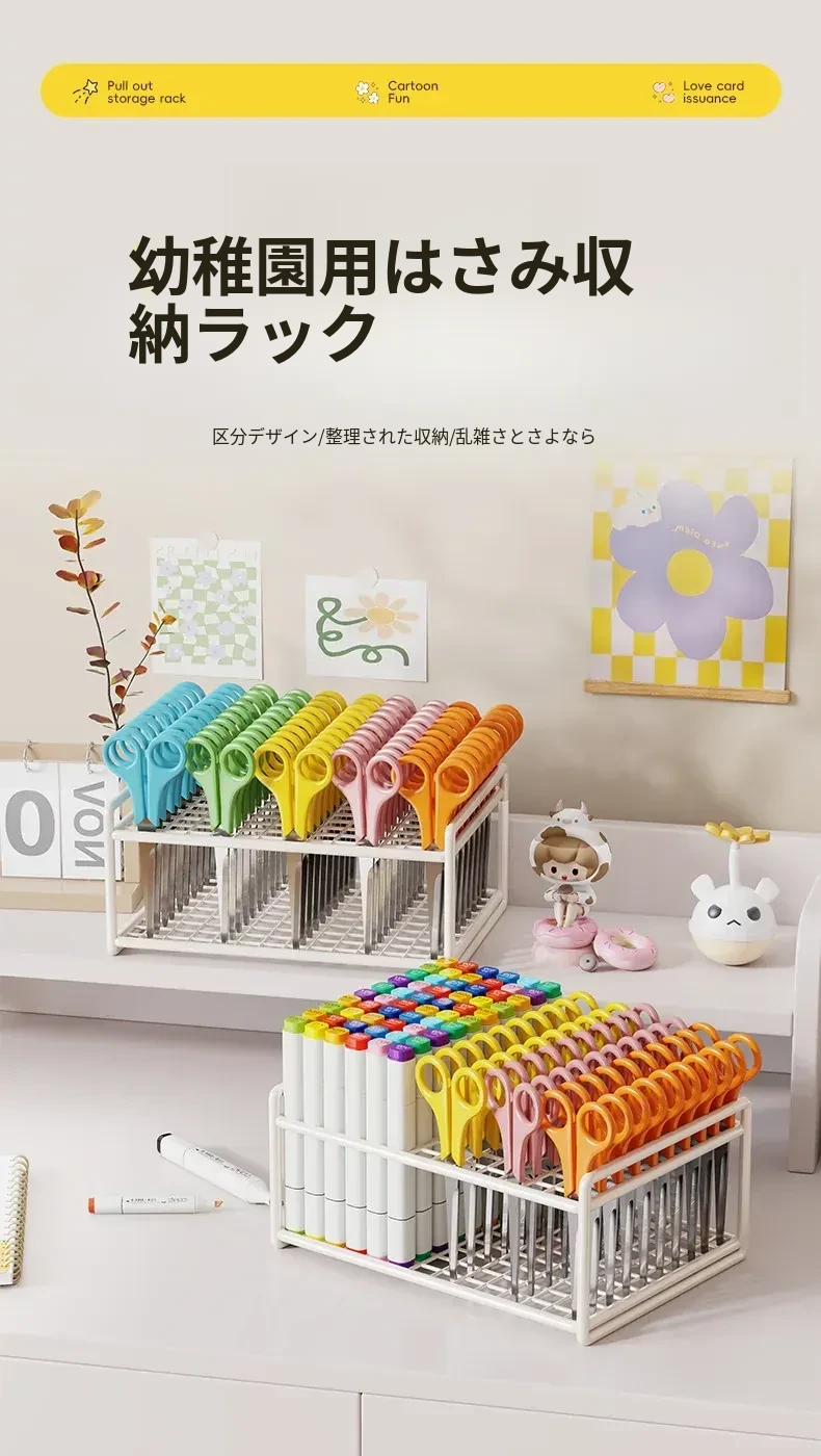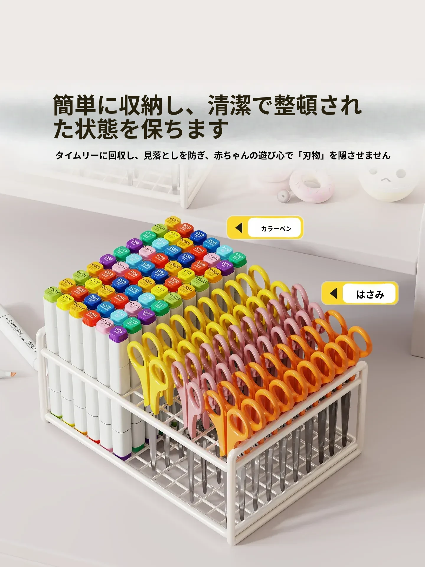 デスク用安全ハサミ収納ボックス|幼稚園向け美術道具整理ラック|子供用分け収納|クレヨン・絵筆をスッキリ整理!