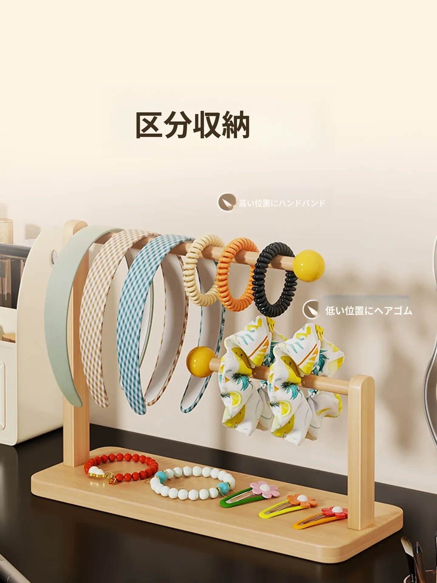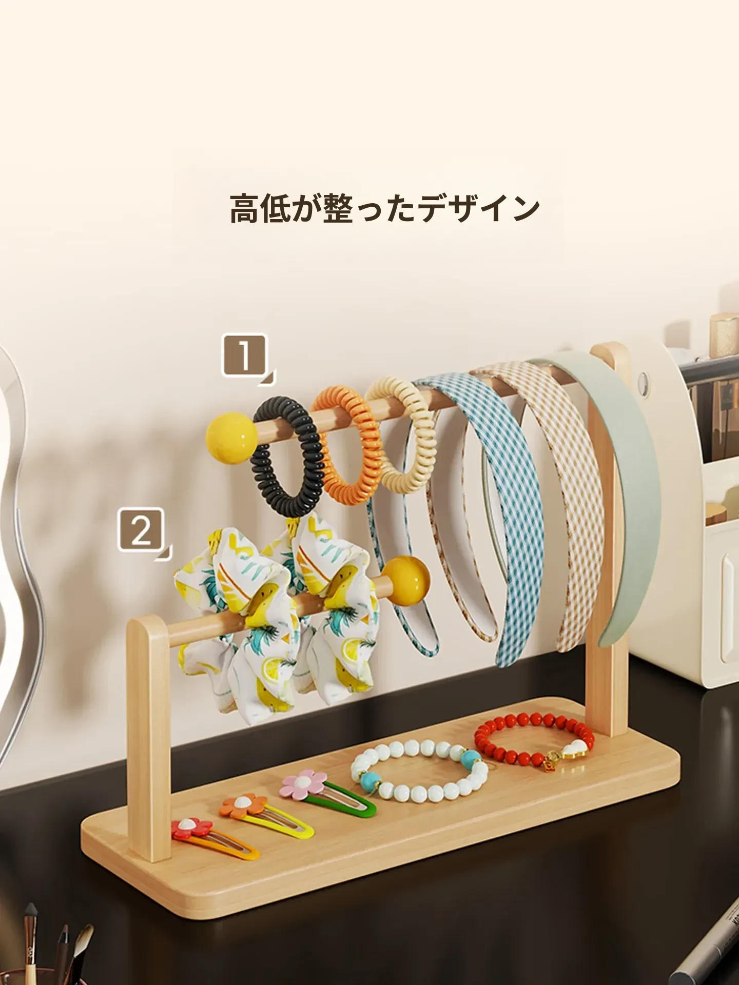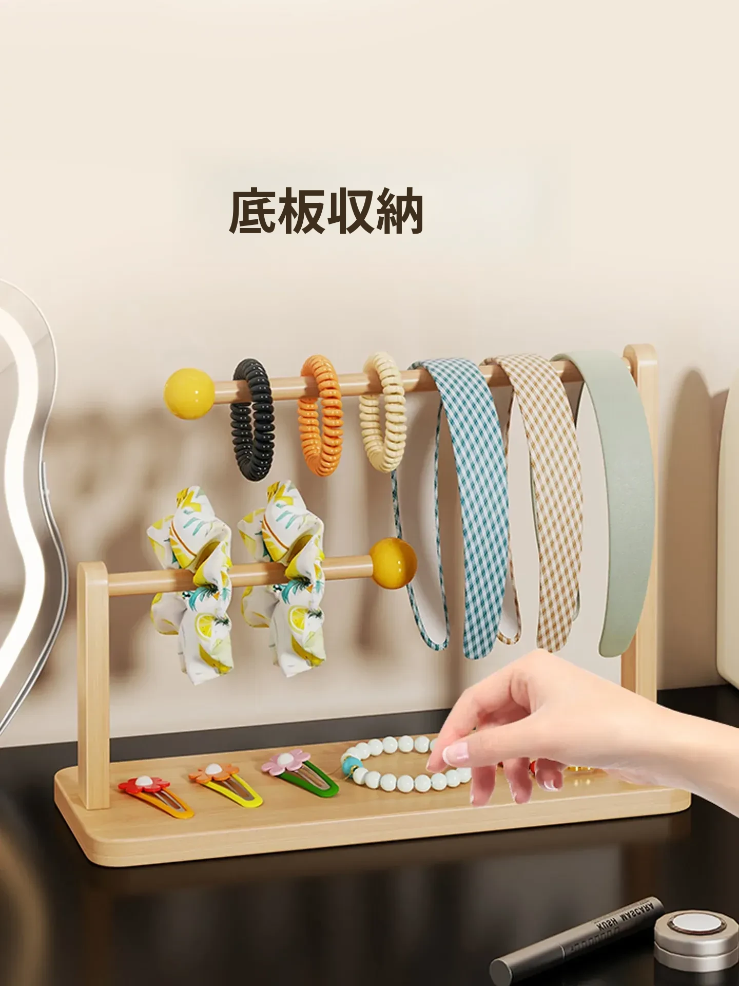 デスク上のヘアアクセサリー収納マジック!大容量ヘアバンド整理ラック - 木製のヘアゴムスタンド、ヘアピンディスプレイも完璧に!おしゃれなインテリアで、使いやすさ抜群。あなたのスタイルを引き立てる必需品です!