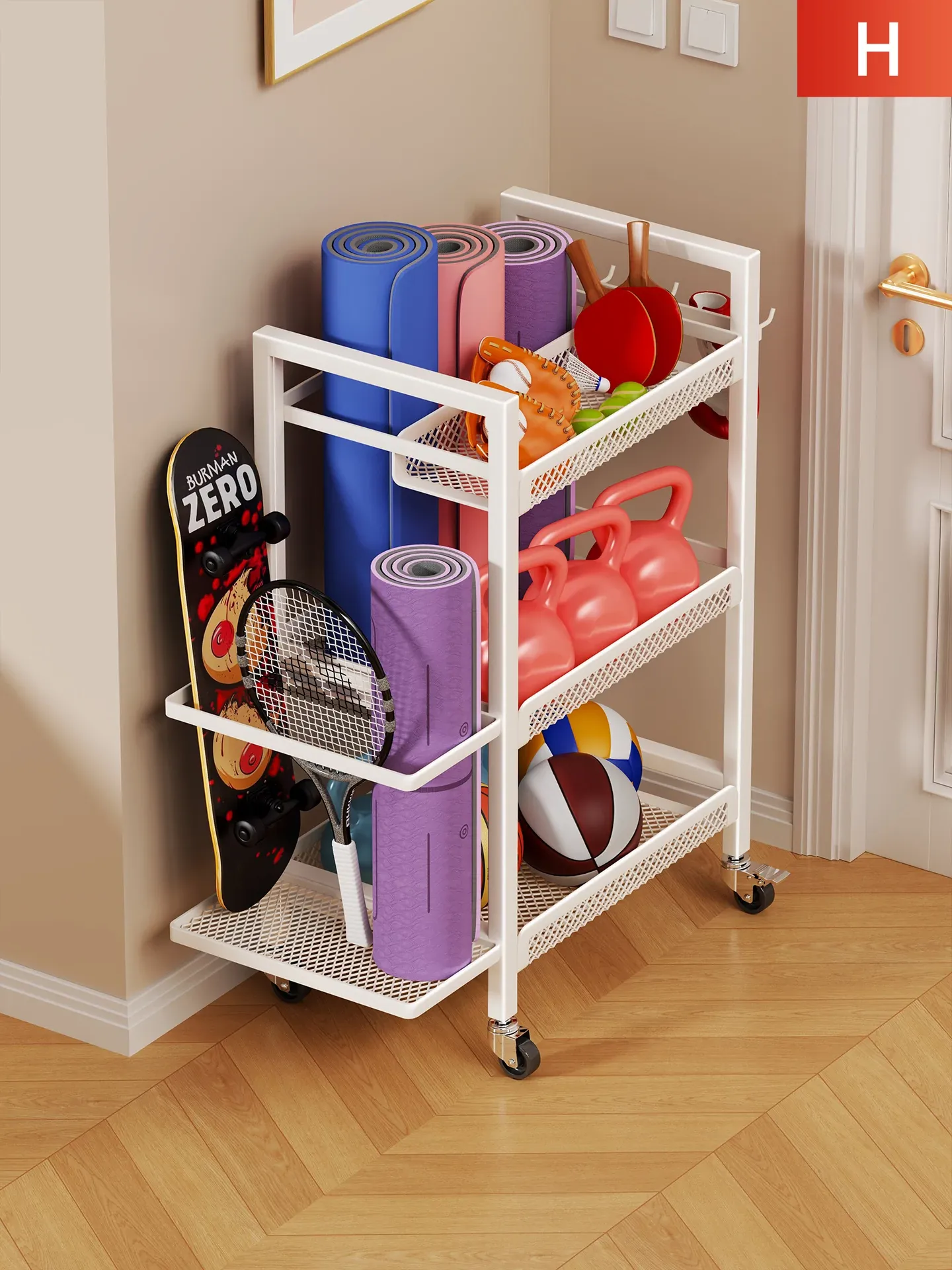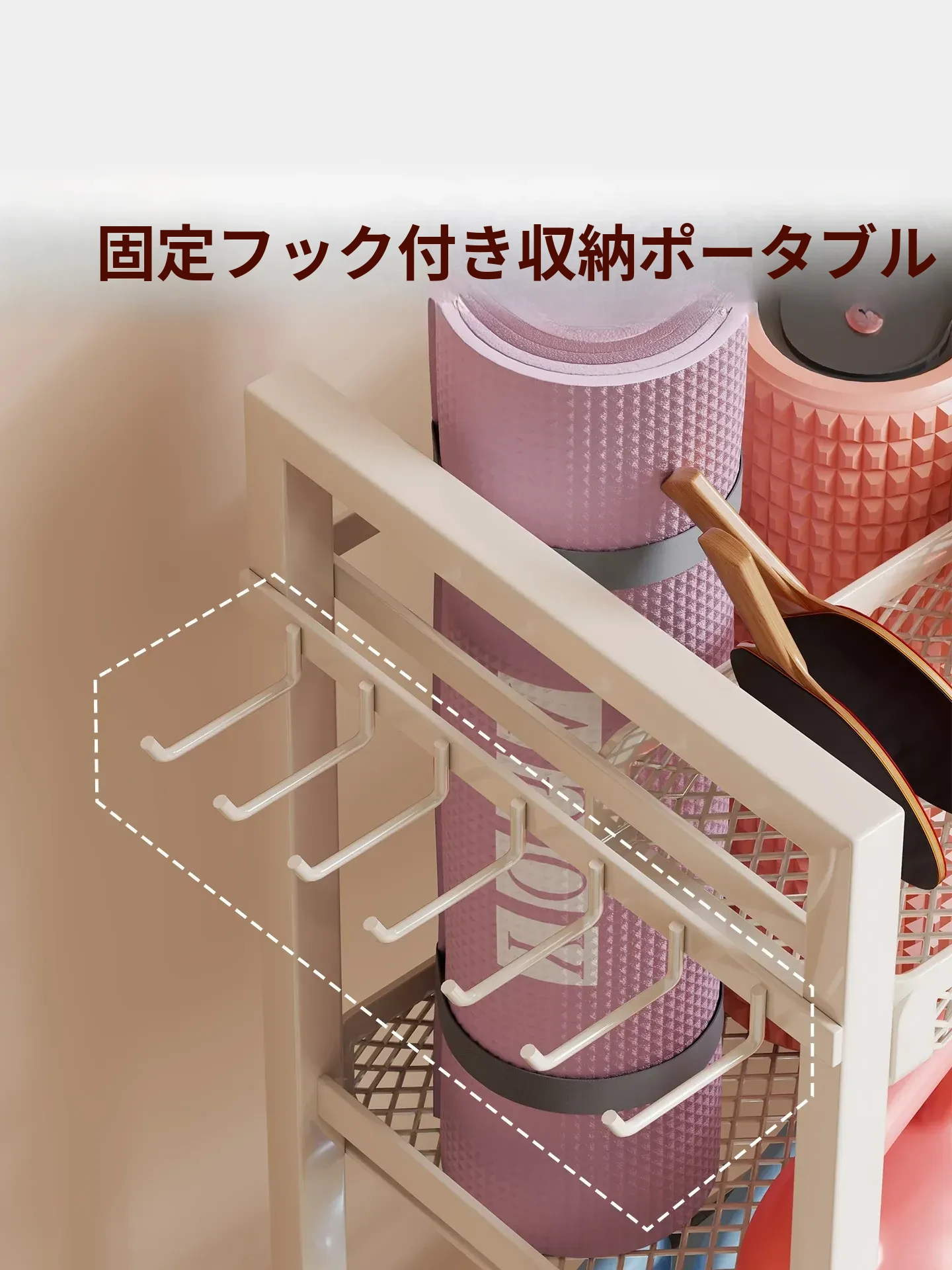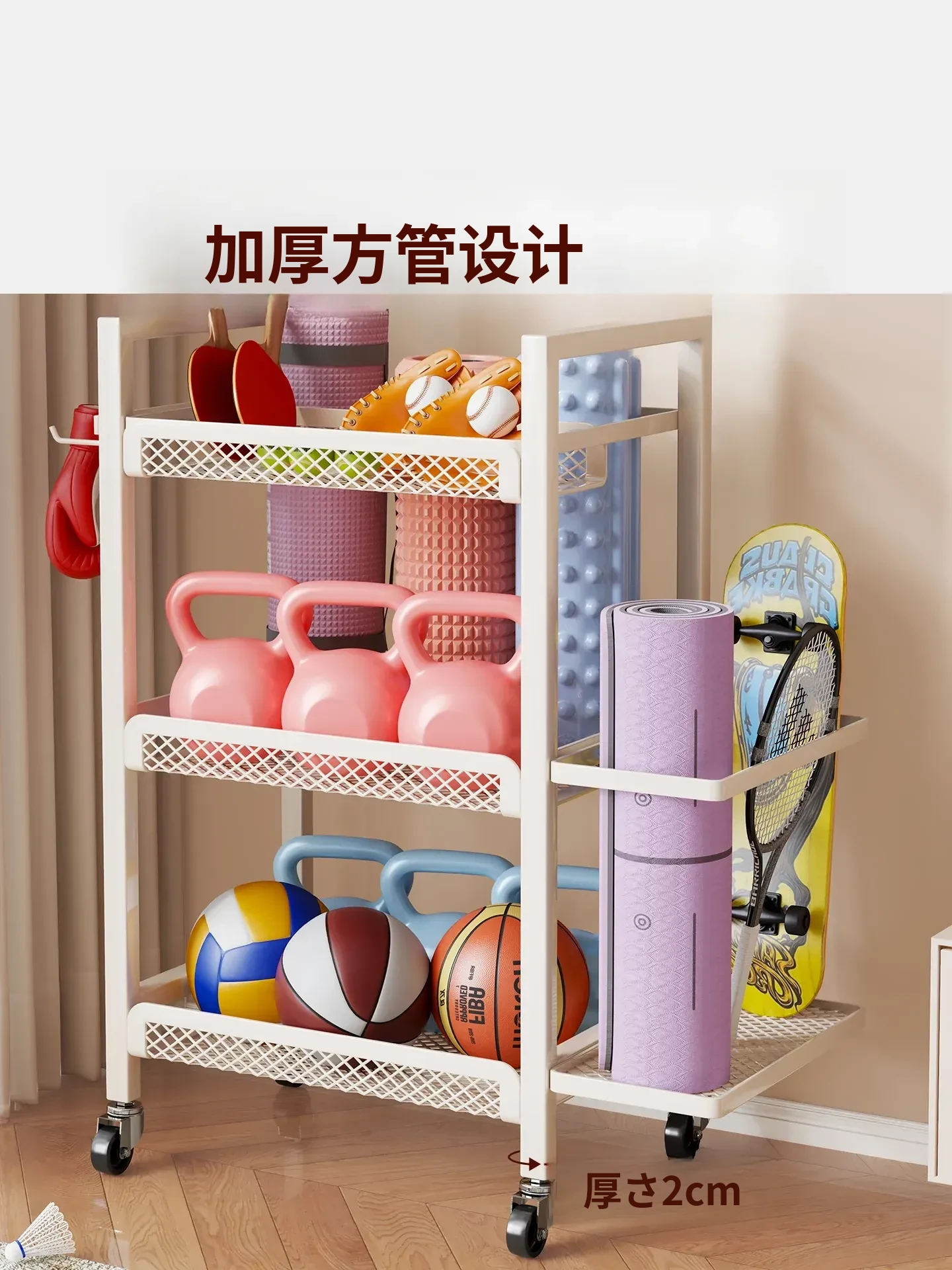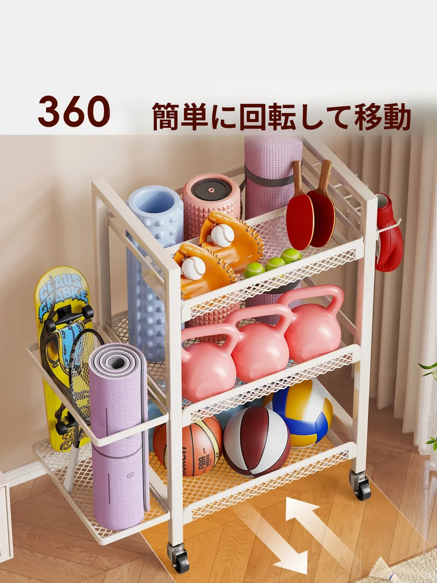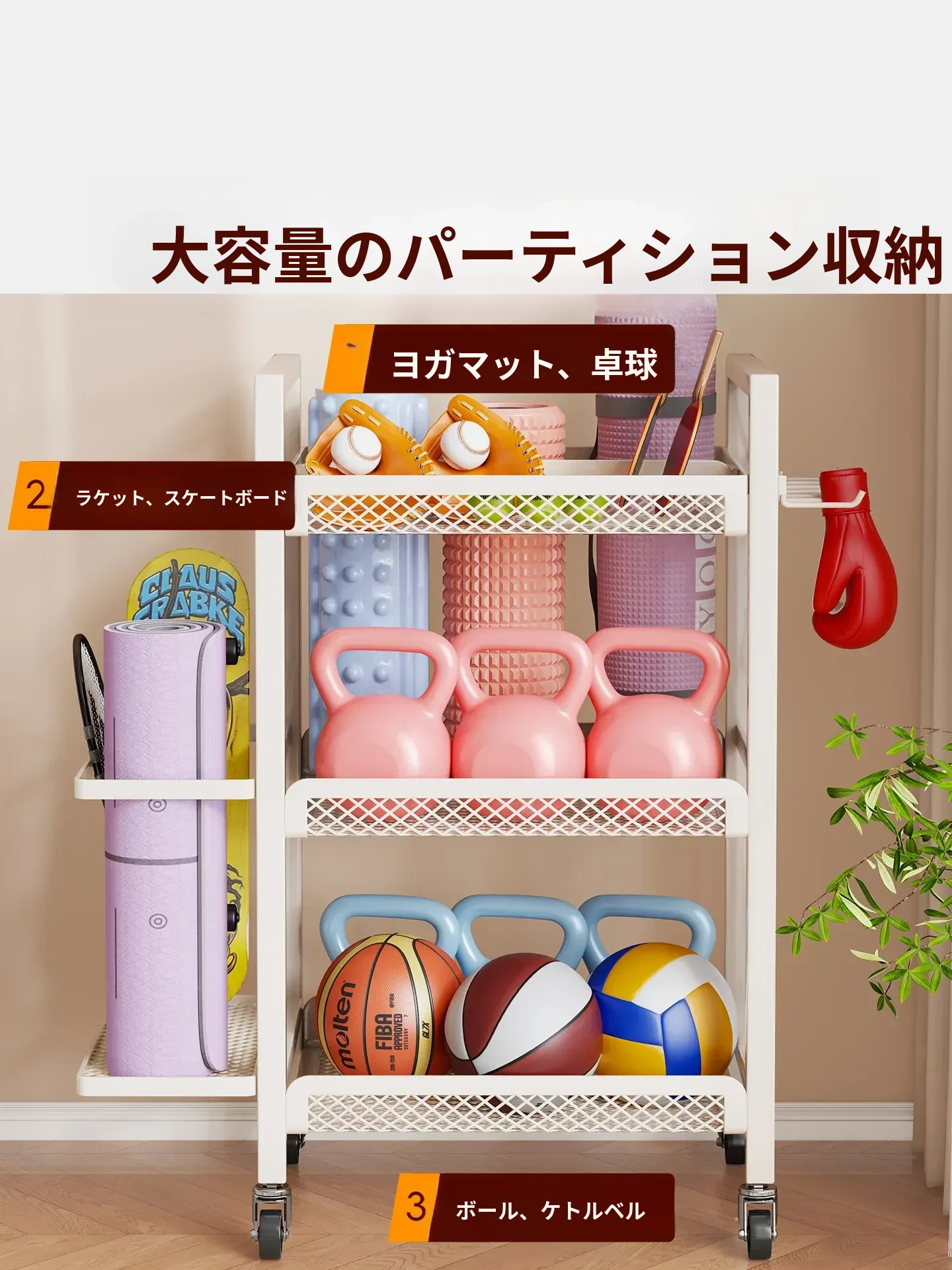 大容量・可移动なフィットネス器具収納ラック!ダンベルやケトルベル、ヨガマットもスッキリ整理。自宅での運動をもっと快適に!