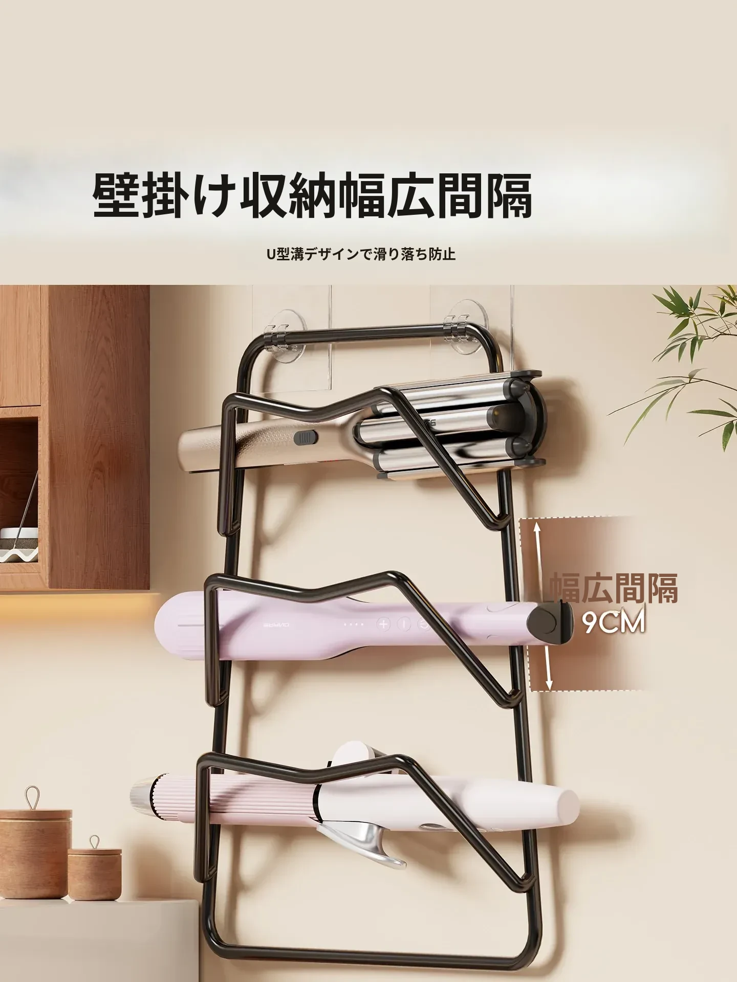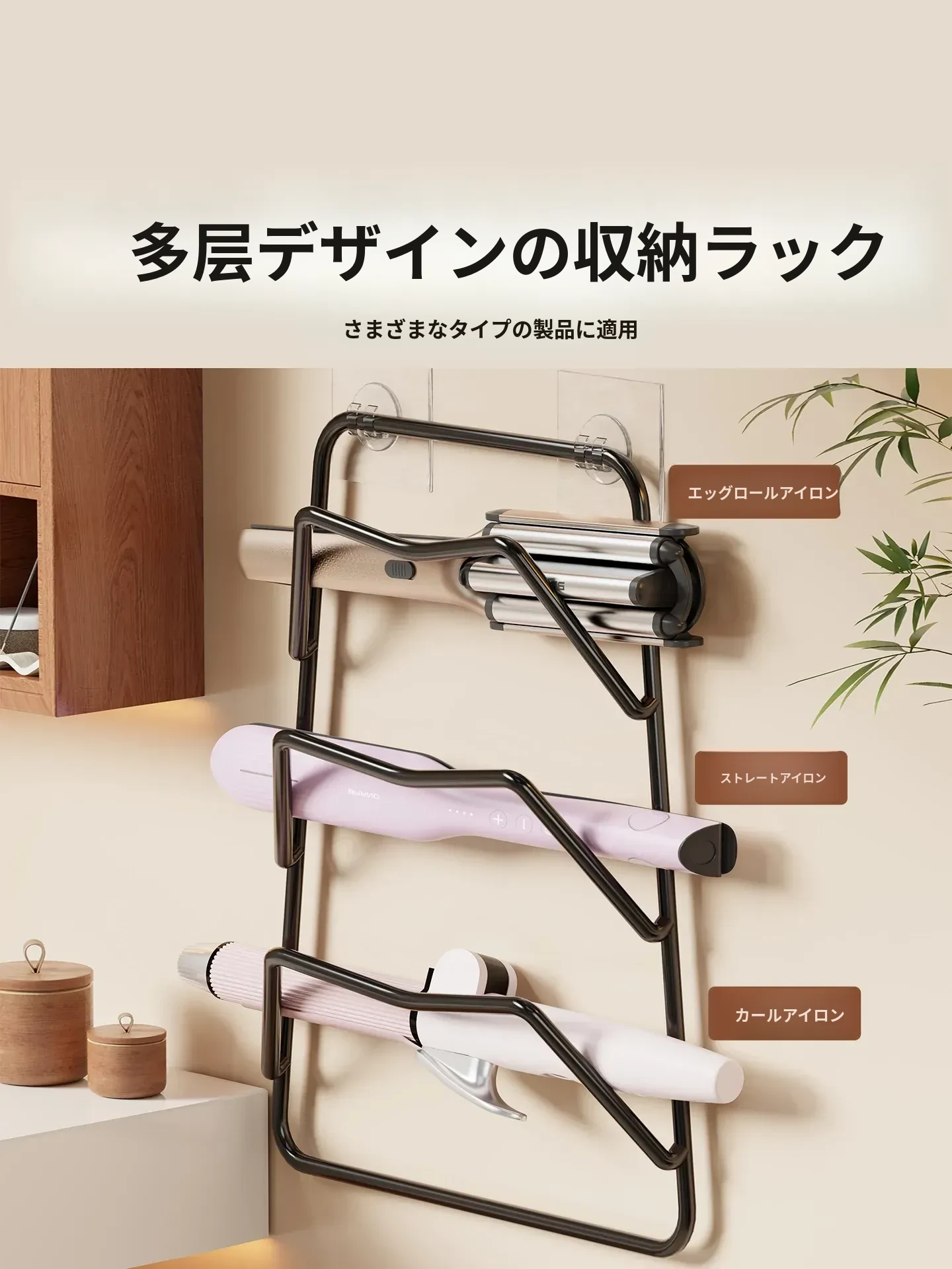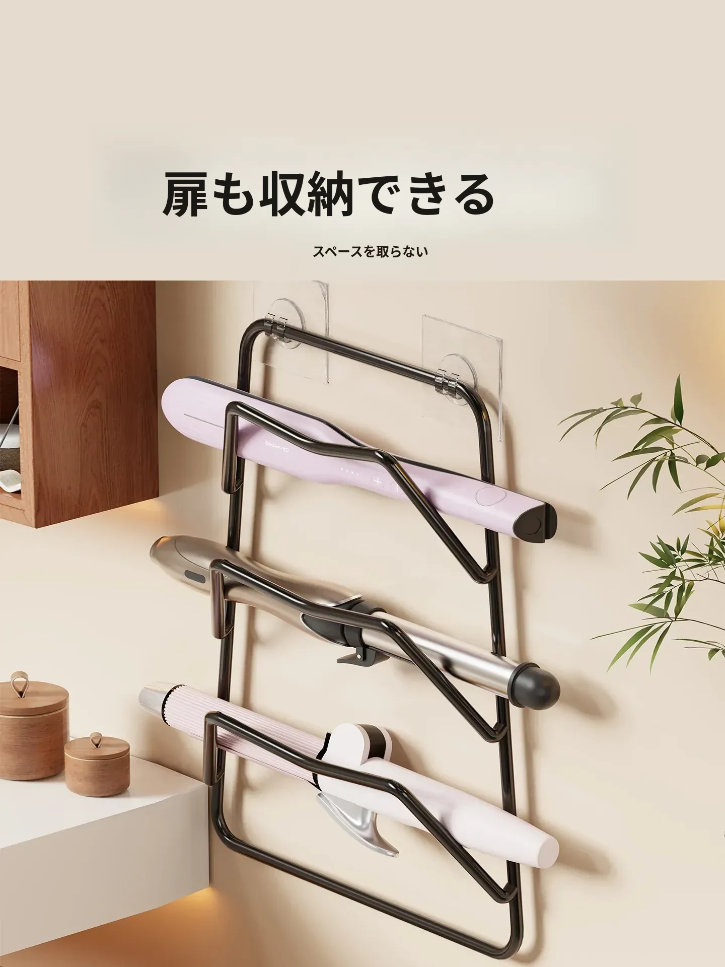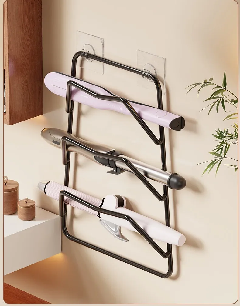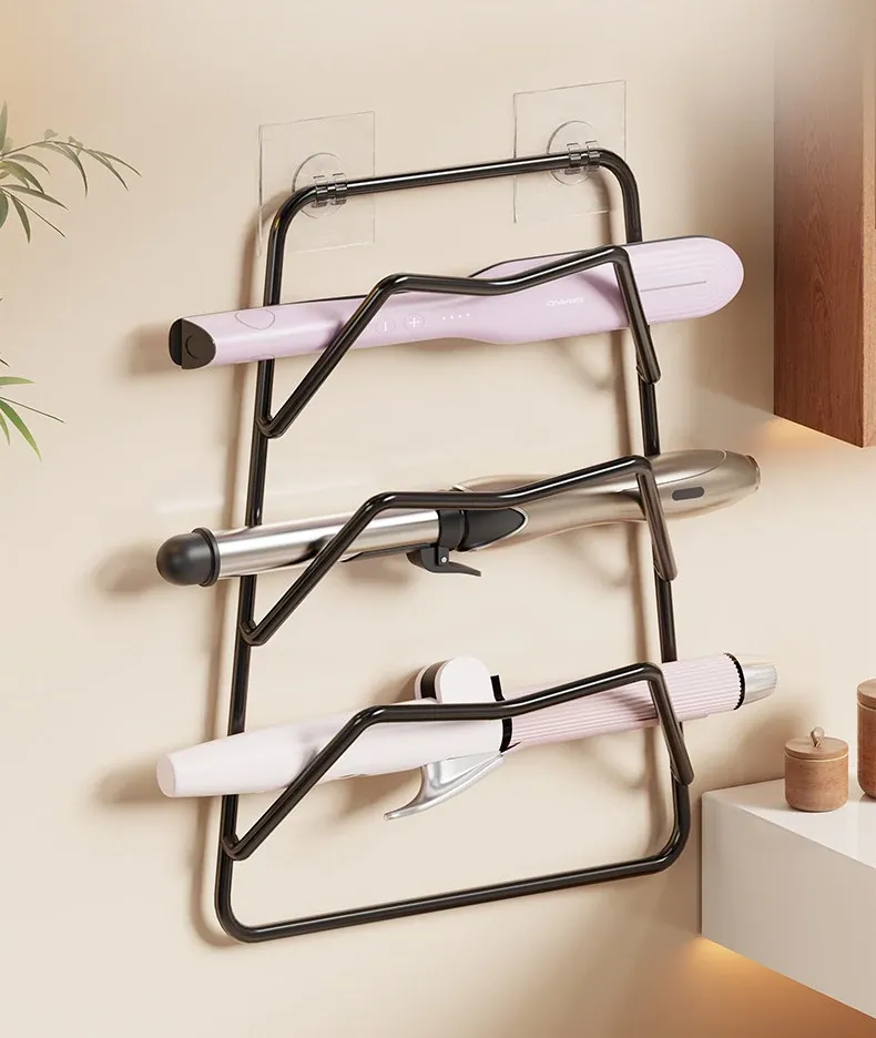 熱を防ぎ、穴を開けずに取り付け可能な多機能ヘアアイロン収納ラック!ドレッサーの下にぴったりフィットし、巻き髪やストレートアイロンを整頓。美しいメイク環境を実現します!