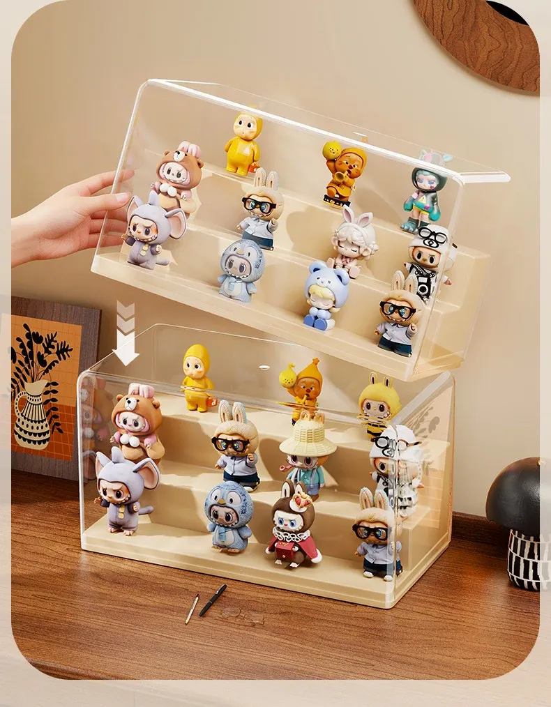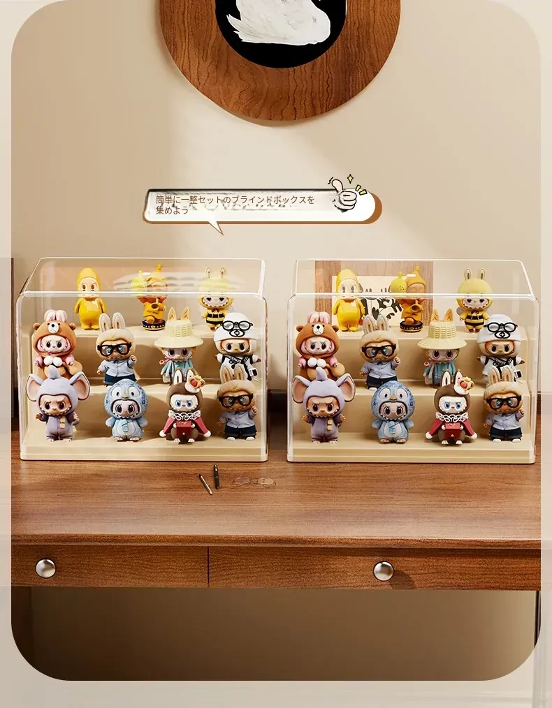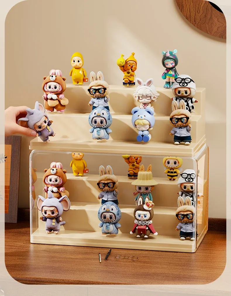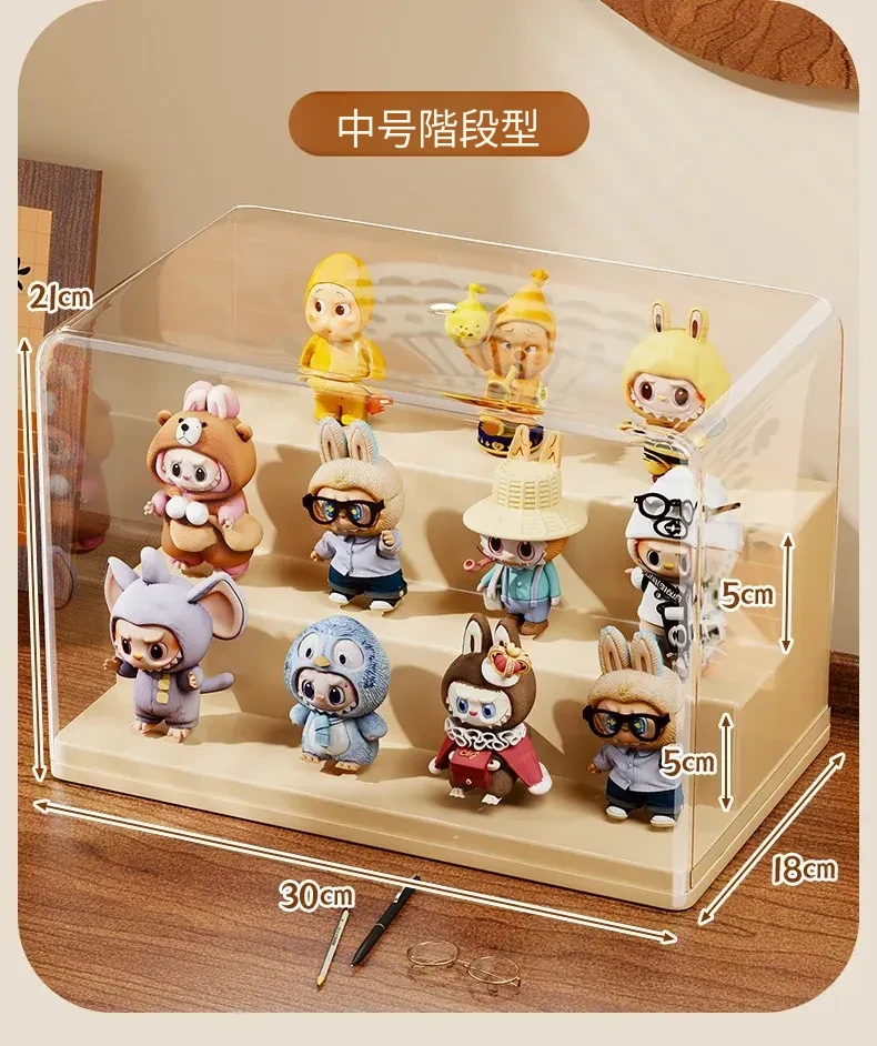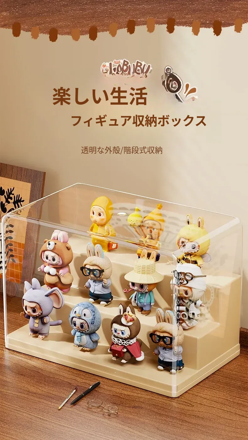 ブラインドボックス収納ケース 透明フィギュアディスプレイキャビネット ポップマート防塵収納棚 ステップ式かわいいコレクションラックで、大切なフィギュアを美しく展示!整理整頓も簡単に!