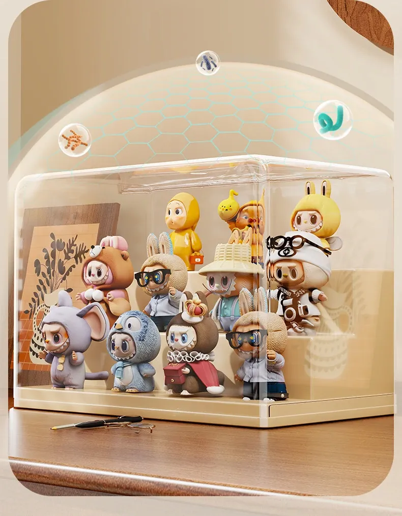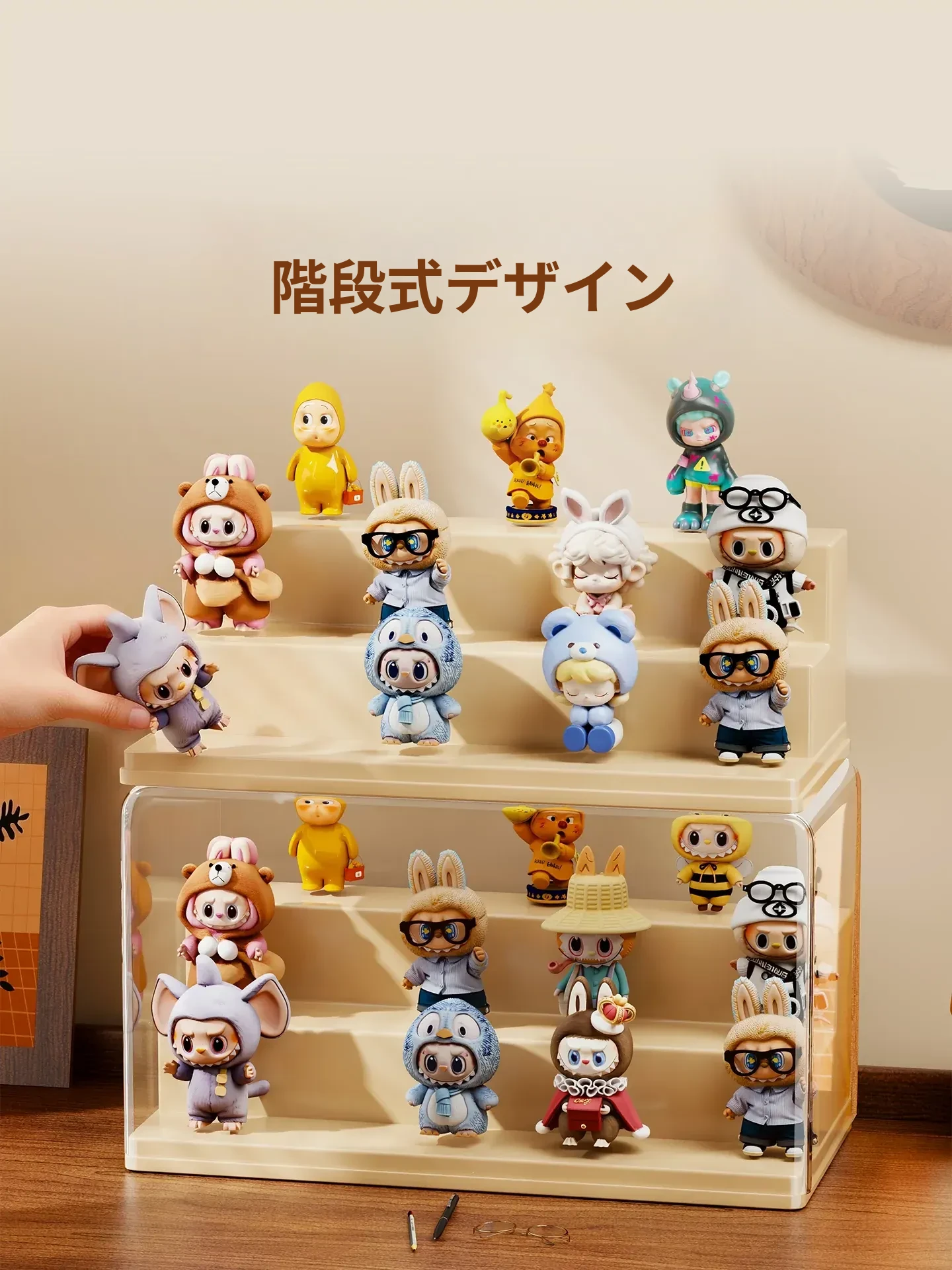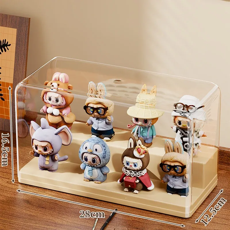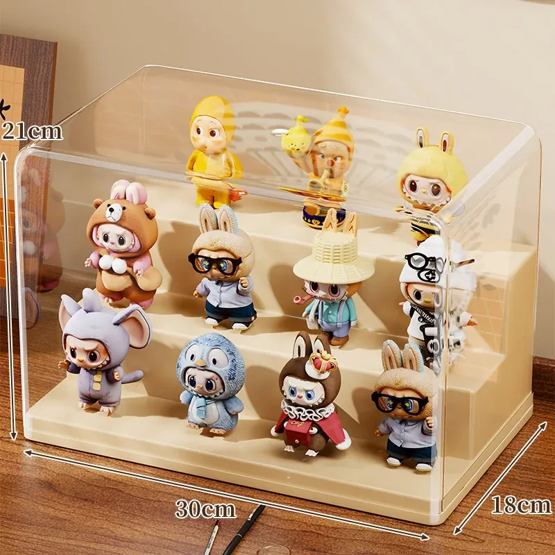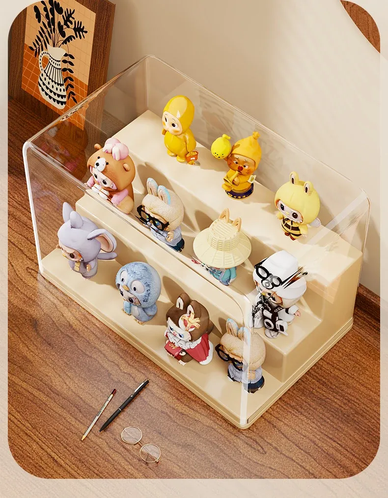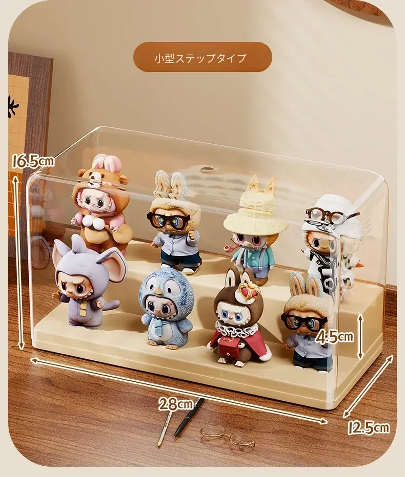 ブラインドボックス収納ケース 透明フィギュアディスプレイキャビネット ポップマート防塵収納棚 ステップ式かわいいコレクションラックで、大切なフィギュアを美しく展示!整理整頓も簡単に!