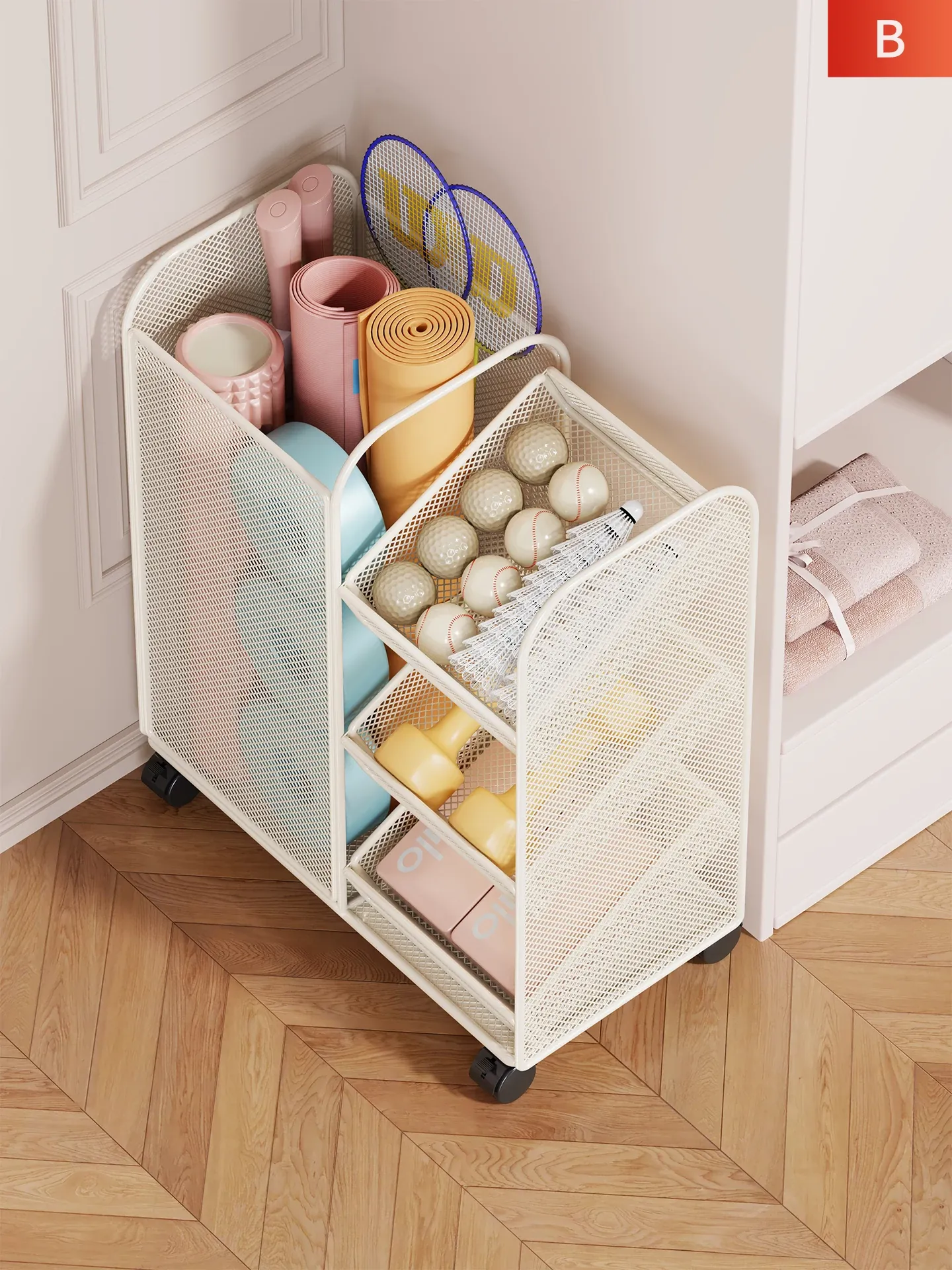 ヨガマット収納バスケット 大容量 家庭用 バスケットボール&フィットネス器具収納ラック キャスター付き 移動可能な隙間収納ラック!おしゃれで実用的、スペースを有効活用して、すっきりと片付けましょう!