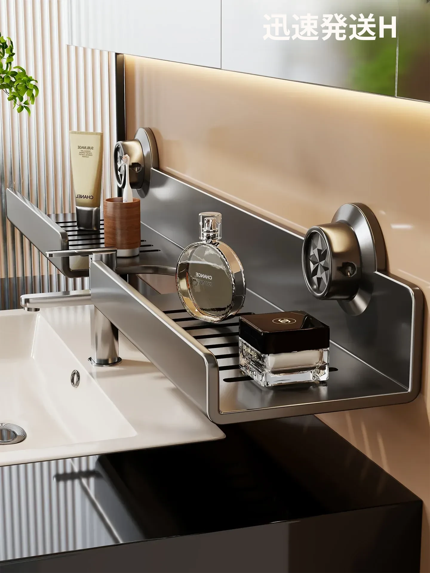 鏡の前に最適!トイレ・バスルーム用 の 丸型壁掛け収納棚 - 洗面台や水栓にぴったりの穴あけ不要デザインで、スッキリ整理整頓!お洒落で実用的なバスルーム収納を実現!